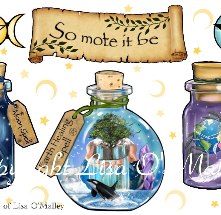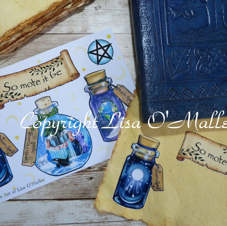 Glossy Vinyl sticker set of 6 stickers taken from my original Artwork, sheet measures 7.5 by 5 inches images range from just under 1 inch to just over 2.5 inches in height great for correspondence, journals, Laptops, tablets and anything else that needs a bit of magic :)