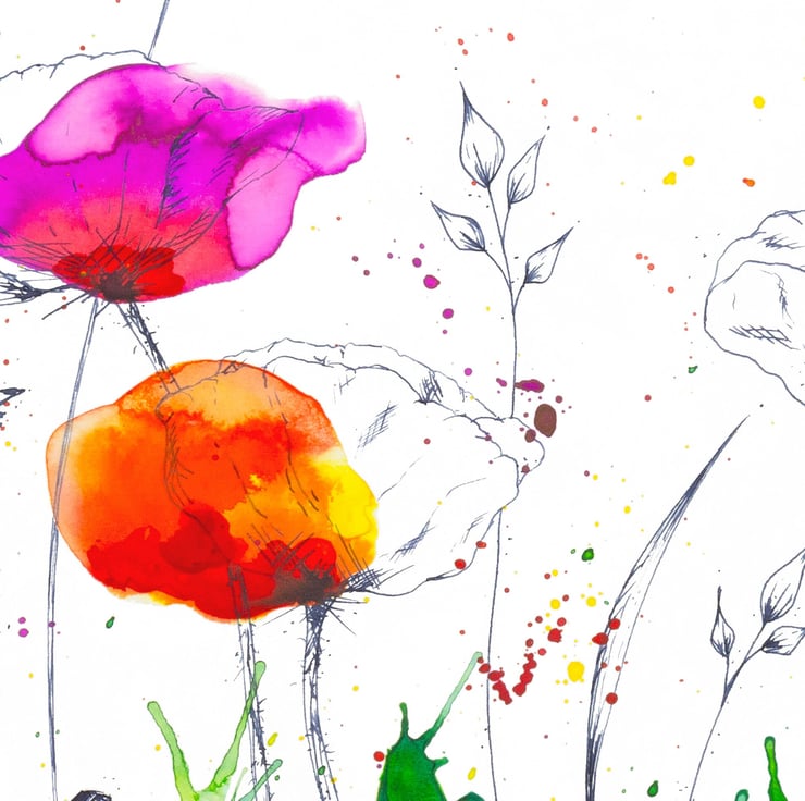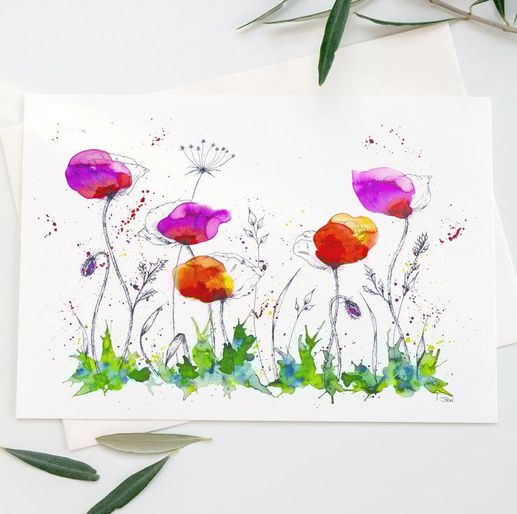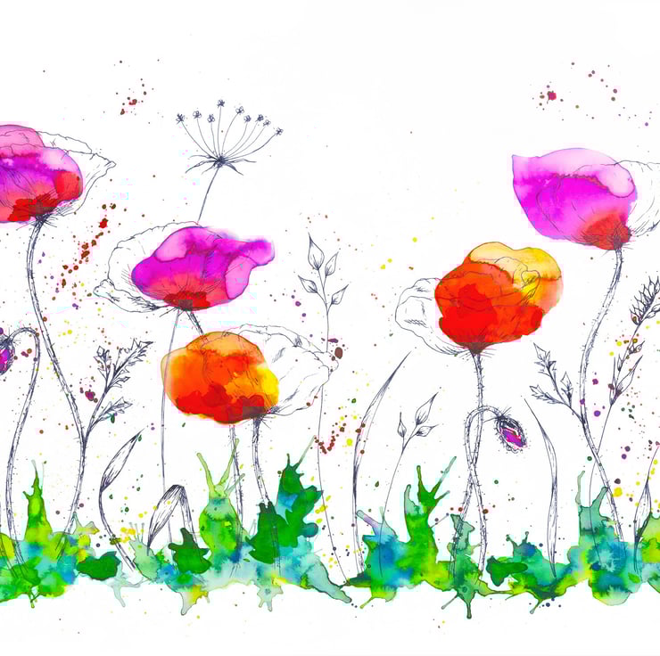 My original painting depicts the vivid beauty of one of the UK's traditional meadow flowers through flowing ink on watercolour paper. The flowers are illustrated using a handcrafted glass dip pen to capture the unique nature of the poppies.