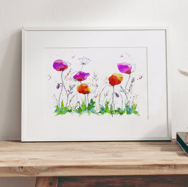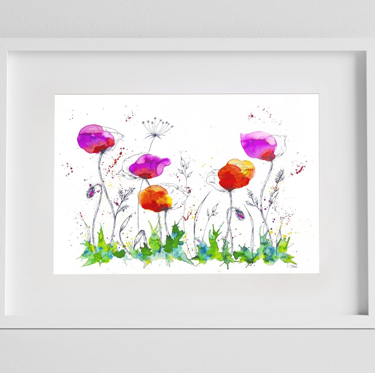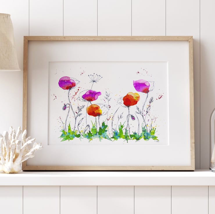 Poppy Meadow watercolour print featuring abstract flowers, painting
