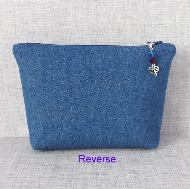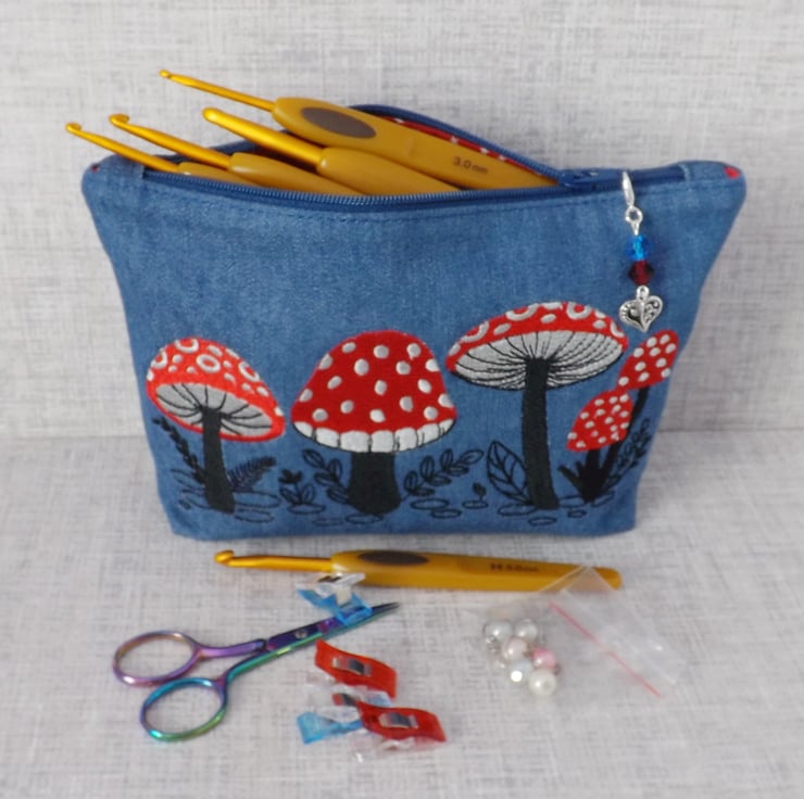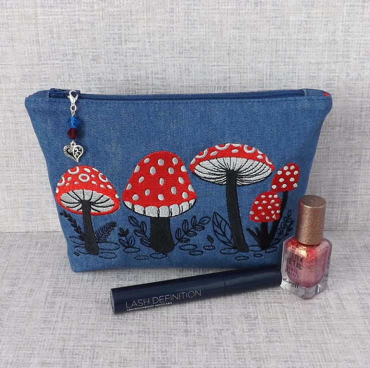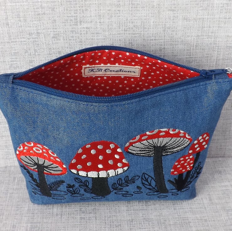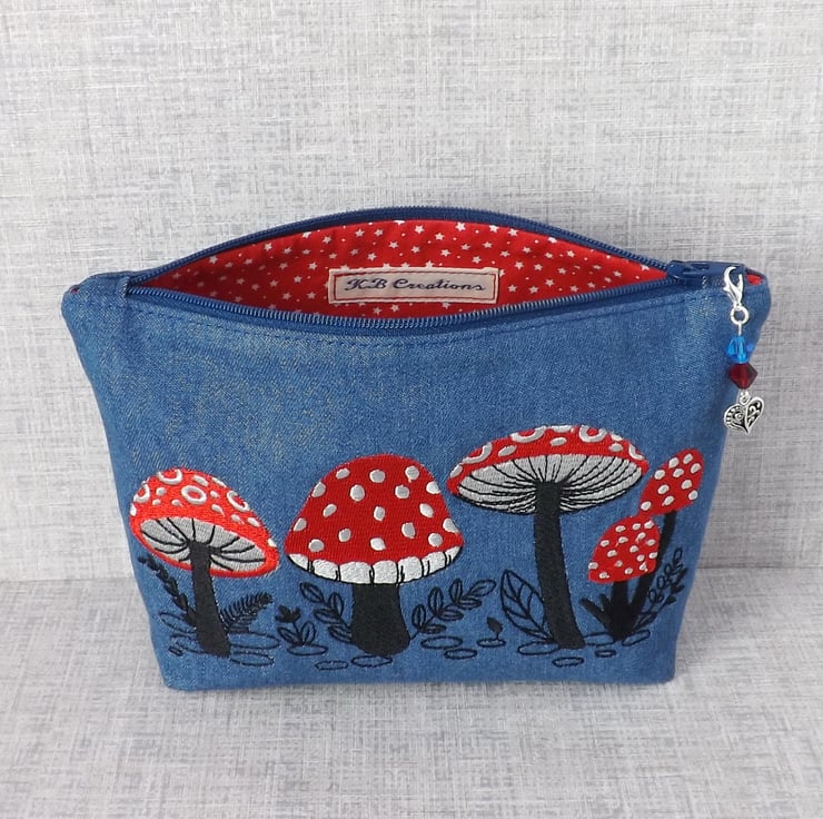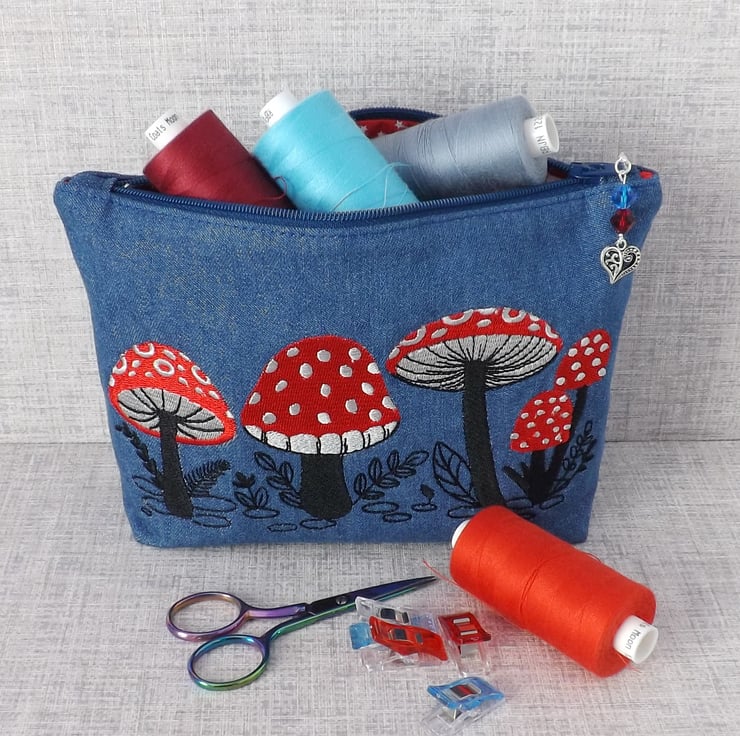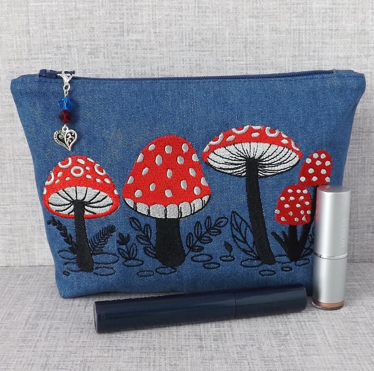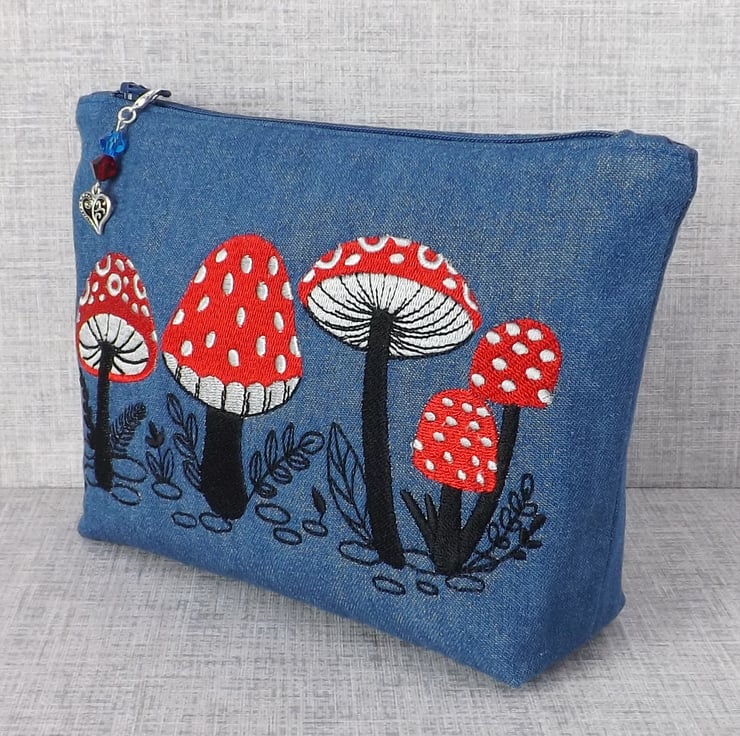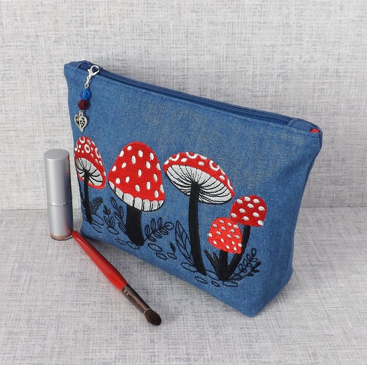 A zipped pouch, made from a medium blue denim fabric and embroidered with toadstools in red, silver grey and black...