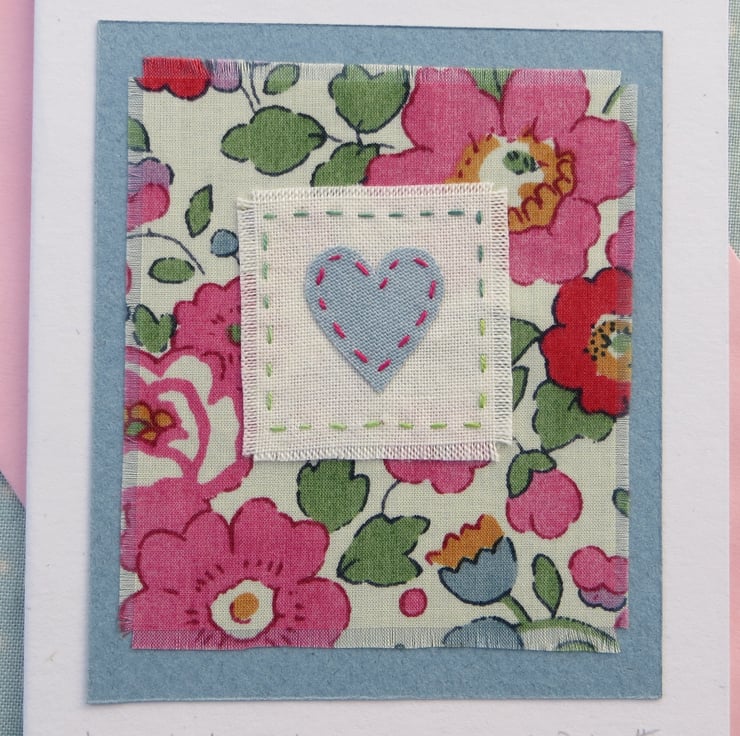 Hand-stitched hand dyed applique heart with cheerful Liberty Tana Lawn cotton print background. Very pretty, perfect for any time when you want to send your love to someone in a special way. The title is: Liberty Lawn Love