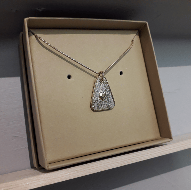 The heart sits on the centre of a slightly wonky triangle (by design), maybe this represents that life is never quite perfect, but that love shines through! Whatever your interpretation, this is a simple, elegant and beautiful pendant which will make a lovely gift for someone special. Made by hand using traditional tools, the Wonky Heart pendant is part of our “Hearts” range and is also available in a gold-plated version.