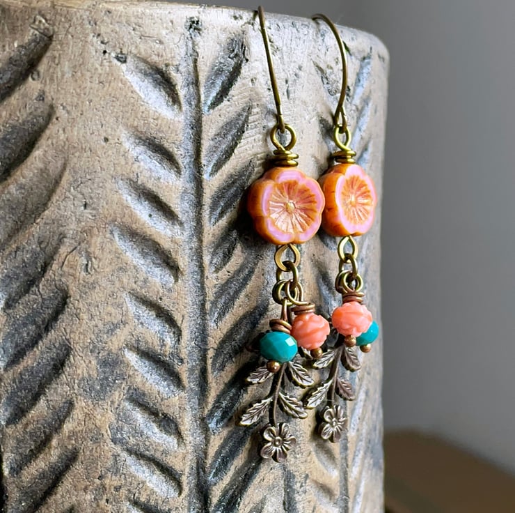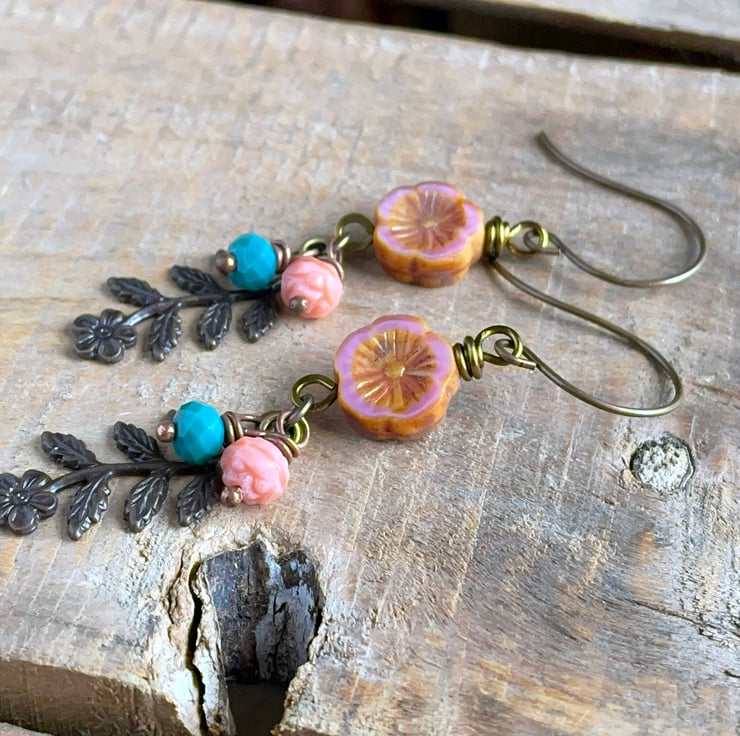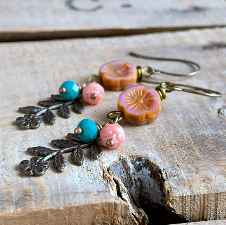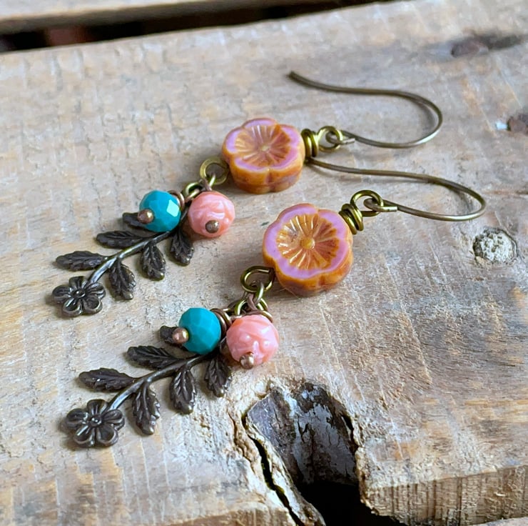 These nature-inspired earrings feature Vintaj brass floret charms paired with delicate Czech glass Hawaiian flowers in a soft shade of coral-pink with a rustic Picasso finish.