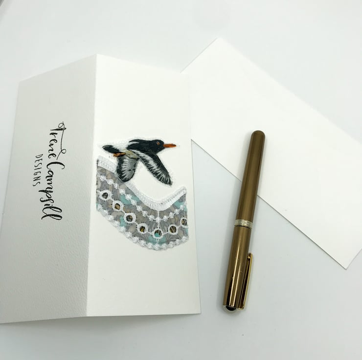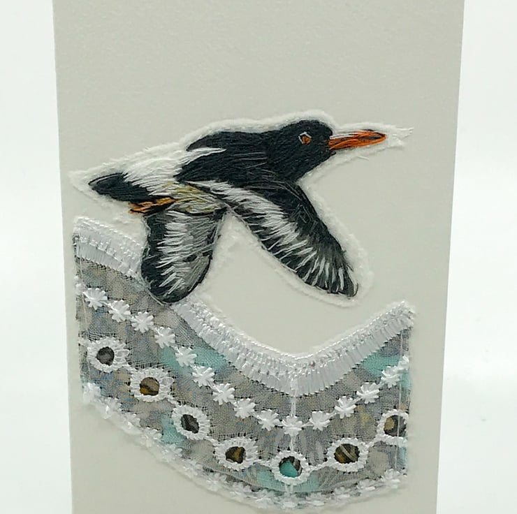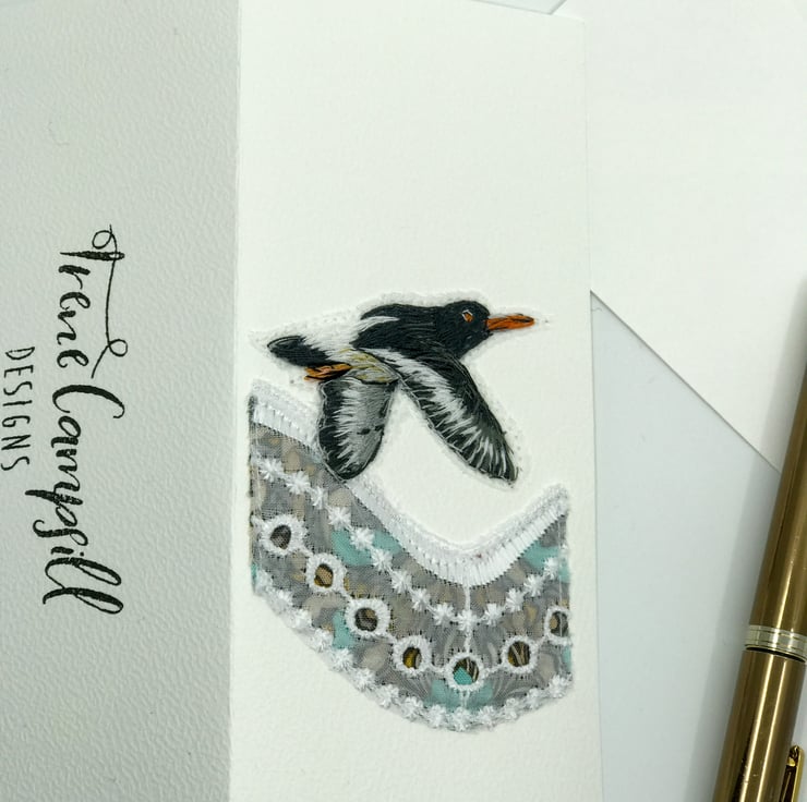 This card is made from a white textured blank card and has been decorated with a oystercatcher which has been hand embroidered onto a piece of a net curtain. The embroidered panel of the net curtain has been backed with a piece of cotton to represent the sea. As I source my fabrics whenever and wherever I find them, I’m not always certain of fibre content.