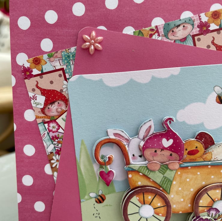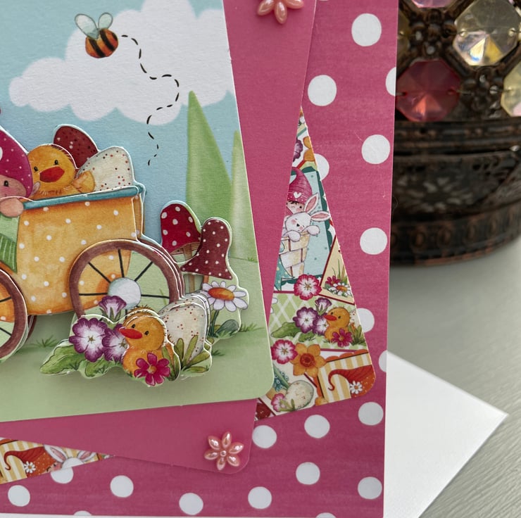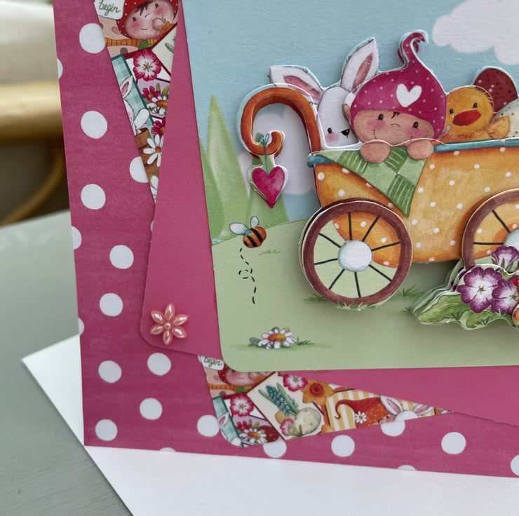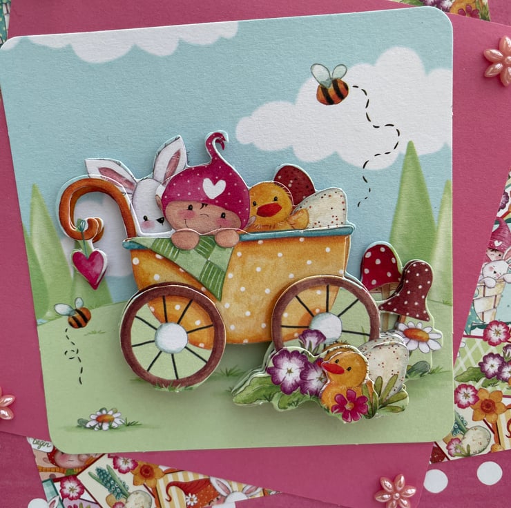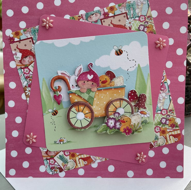A cuter than cute card for any little one. This 15x15cm card can be used for a new baby or small child birthday card. The background is a fabulous pink and white polka dot. This is topped with a patterned paper with cute images on. This is topped with a matching pink paper. The main feature is a layered decoupage image of a cute baby wearing a pink polka dot hat sitting in a pram with a rubber duck. This is decorated with flowers, toadstools, eggs and hearts. A very cute design and something a little different for a new baby, a small child birthday or even Easter. The design is finished with pearlised pink flowers. There is no greeting on the front or inside the card so it makes it very versatile, greetings can be added if you want.