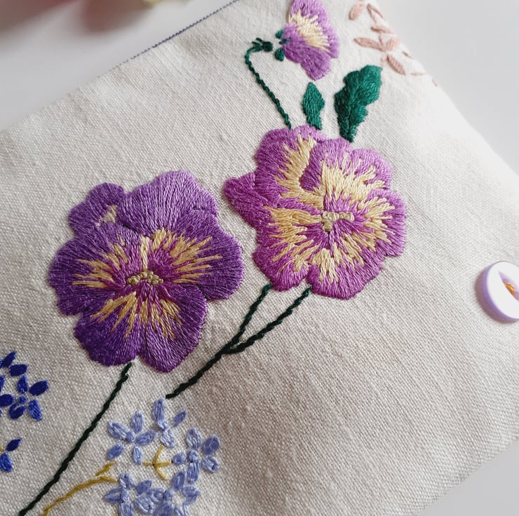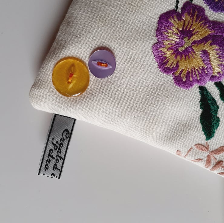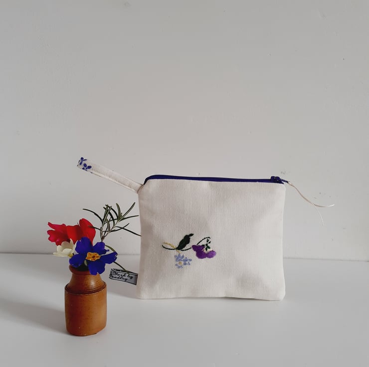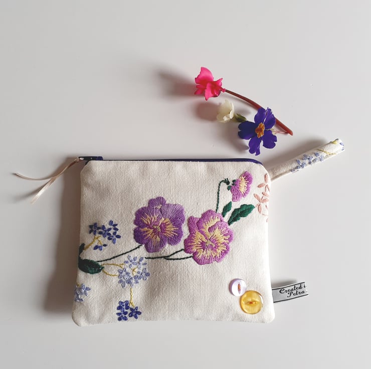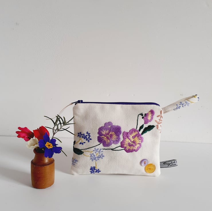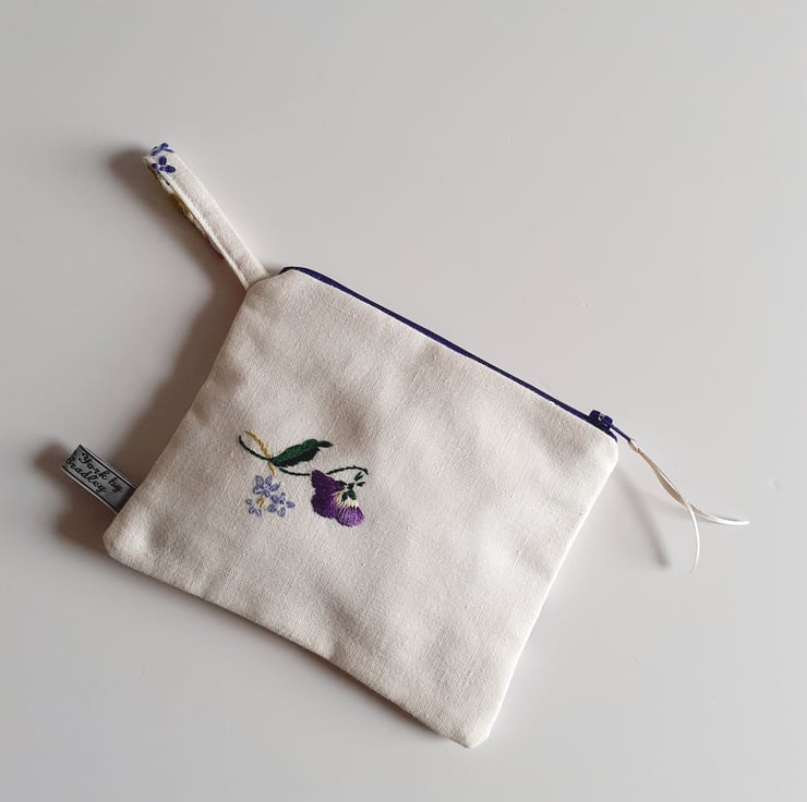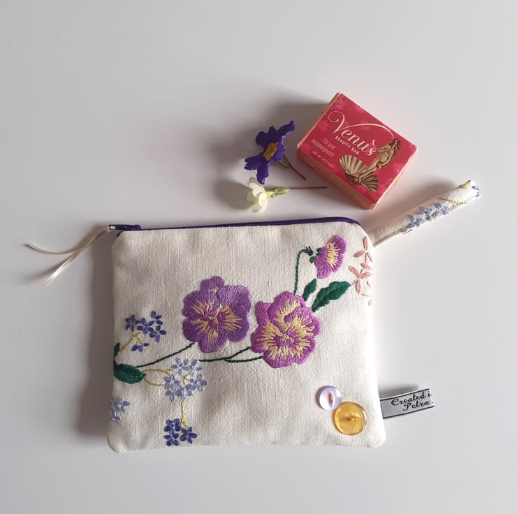 A sweet little zip up make up bag, made from vintage table linen. The front is embroidered with a spray of purple pansies from the corner of a vintage handstitched tablecloth, and the back has a tiny pansy flower. Altho it had seen better days, there were enough fragments to make into a set of sweet little bags. Perfect for make up or storage, they would make a lovely present for a bride to be, as a special birthday present for a friend, or as a Mothers day gift.