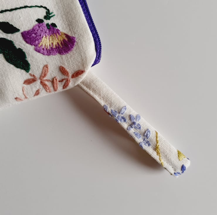 It measures 17cm by 14cm with a purple 17 cm zip and is lined in floral cotton.