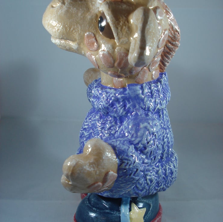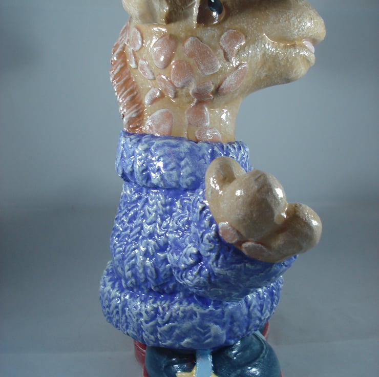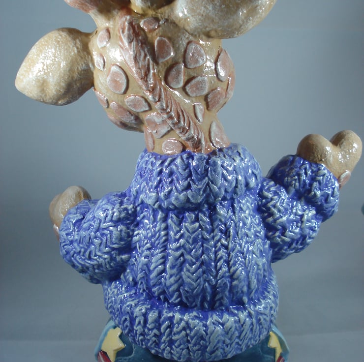 I have for sale a ceramic animal figurine ornament, which was hand painted by myself. It is a cute looking, standing giraffe, dressed in a purple coloured chunky jumper and a pair of colourful shoes. This would make a lovely addition to anyone's home, or perhaps given as a gift.