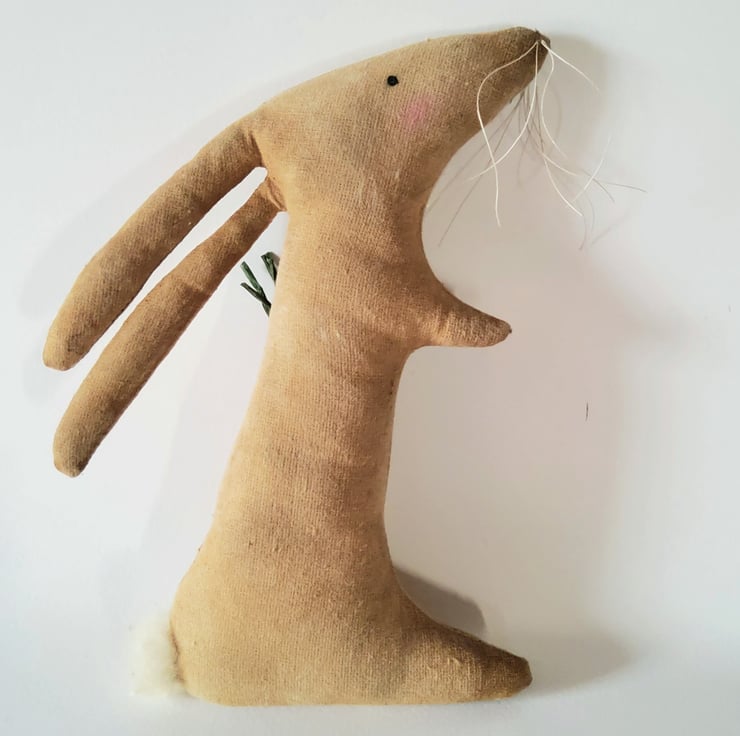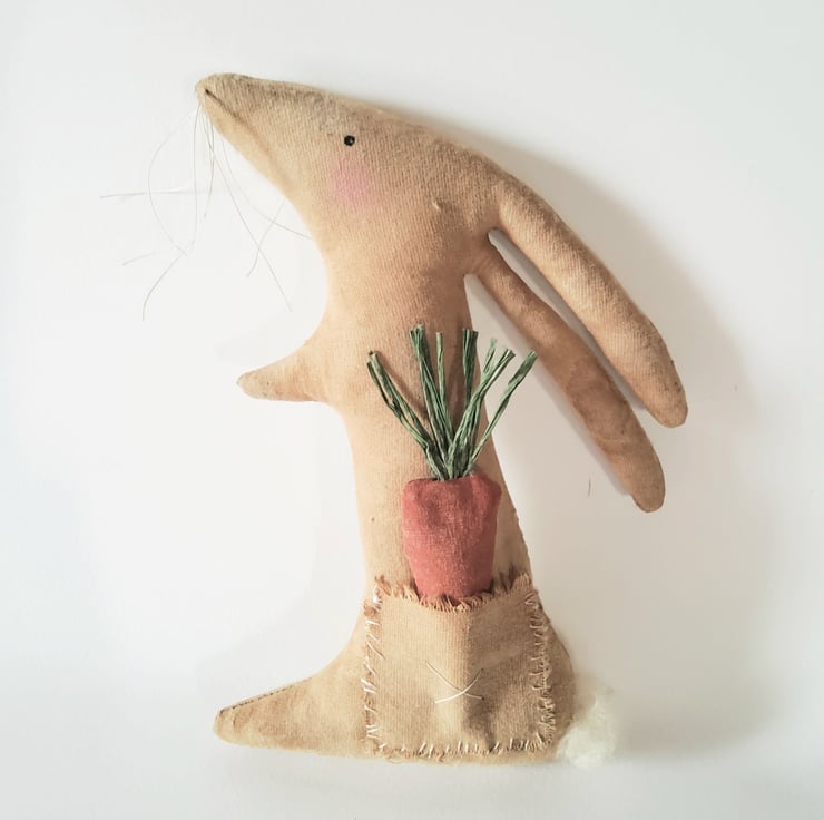 Rabbit is made from coffee and cinnamon dyed calico, sanded back for a vintage ,primitive look. The pocket holds a painted and dyed carrot and has been randomly stitched to Rabbit' s body. The cheeks are gently flushed ,the eyes are painted and the whiskers are vintage linen thread. Oops nearly forgot - the tail is wool.