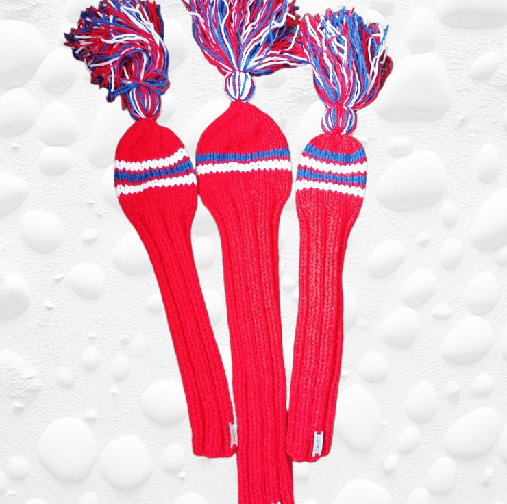 Red with blue and white stripes and a mixed colour tassel finish knitted golf headcovers.