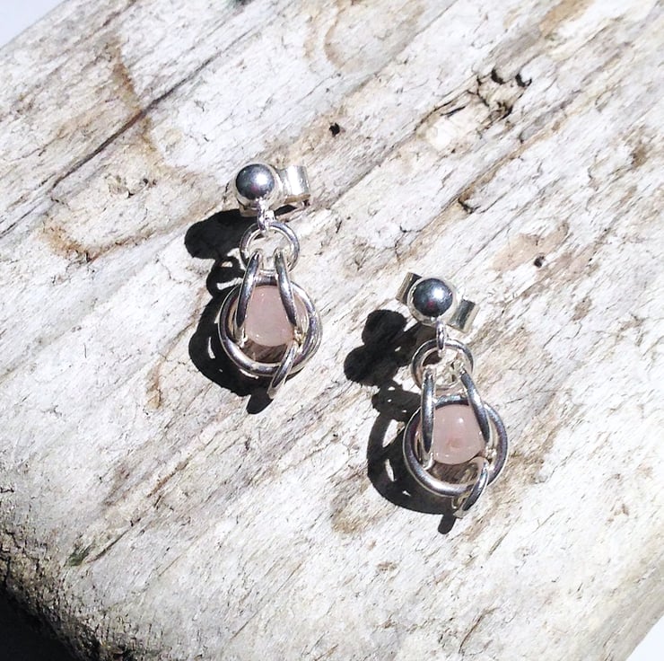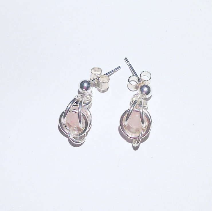 These lovely earrings are hand crafted from sterling silver jump rings holding a rose quartz gemstone bead.