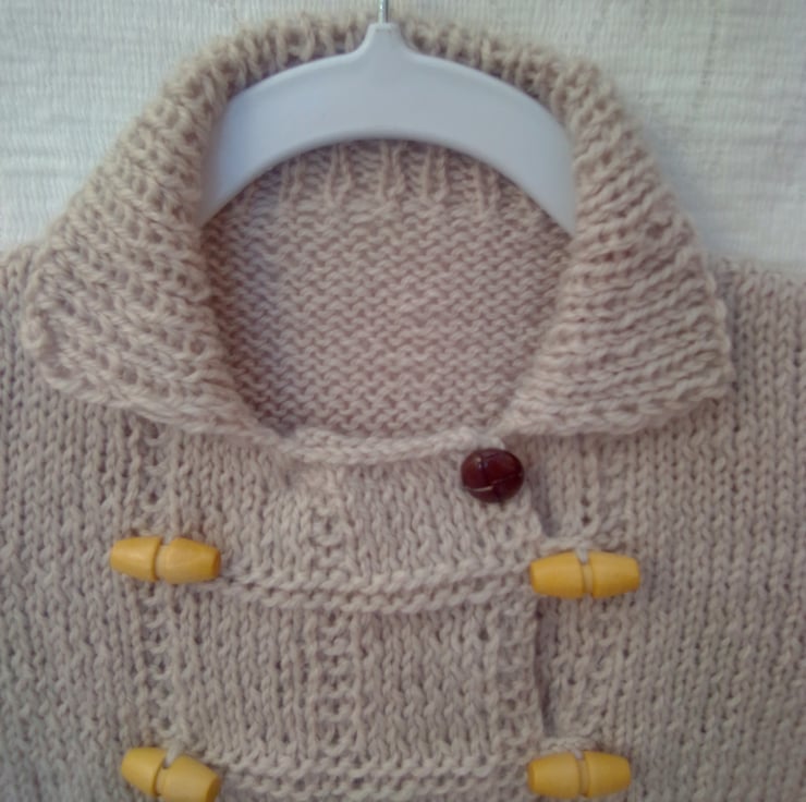The coat would make an ideal gift for a toddler's birthday or Christmas gift or for your own little ones to keep them snug and cosy. The duffle coat is in stock in a size to fit a 9 - 12 month old toddler with an 18 inch chest, in the biscuit colour shown. It can also be made for you in a size and colour of your choice. Please see below for the available sizes and the corresponding prices and state the colour required when you order, most colours are available. Please allow 1 - 2 weeks processing time for the coat to be made and posted to you.