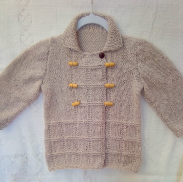 Hand knitted duffle coat for little girl's made using double knitting yarn. It has checkerboard pattern and it is fastened using 6 wooden toggles in a double breasted fashion.