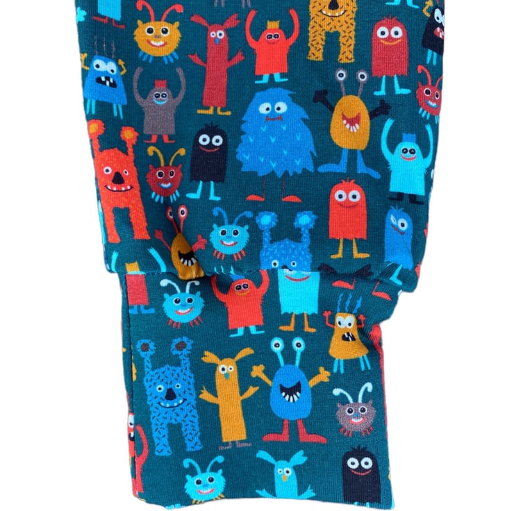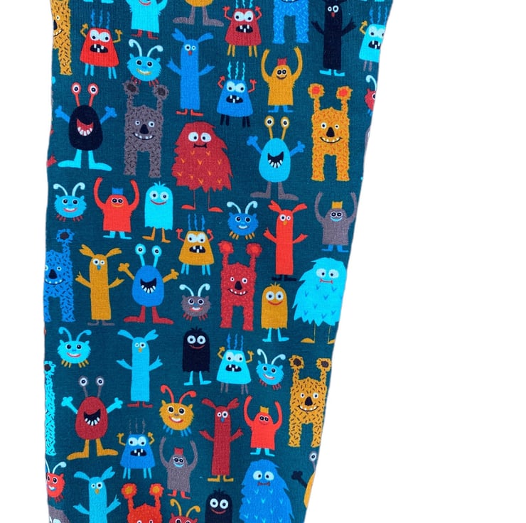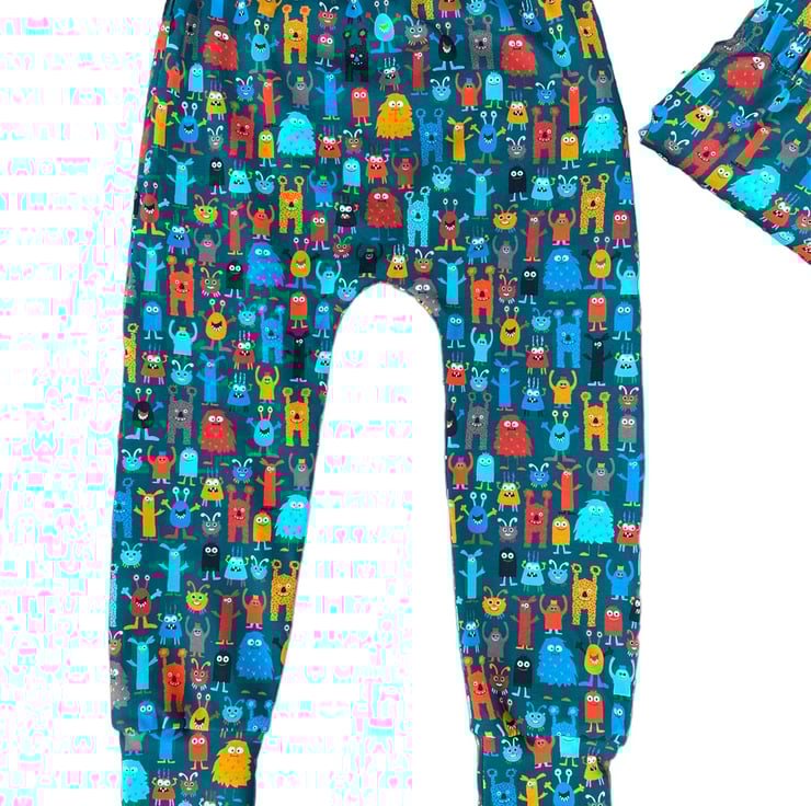 Super soft, Comfy, Cuffed stretchy Cotton (with Lycra) Unisex leggings in a fabulous Teal fabric with colourful Little Monsters in a slim harem style