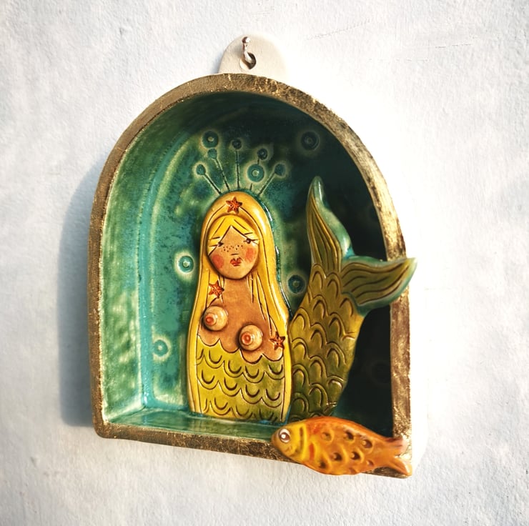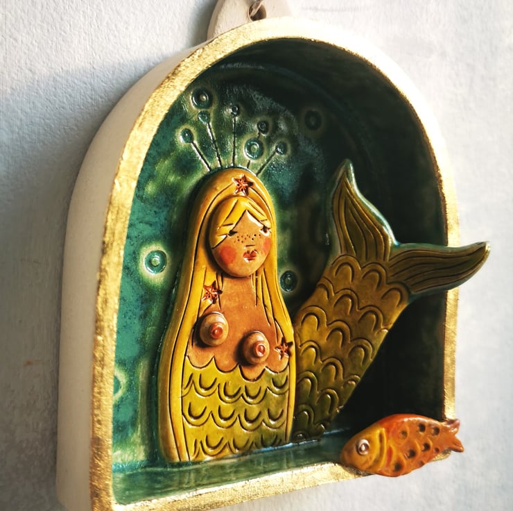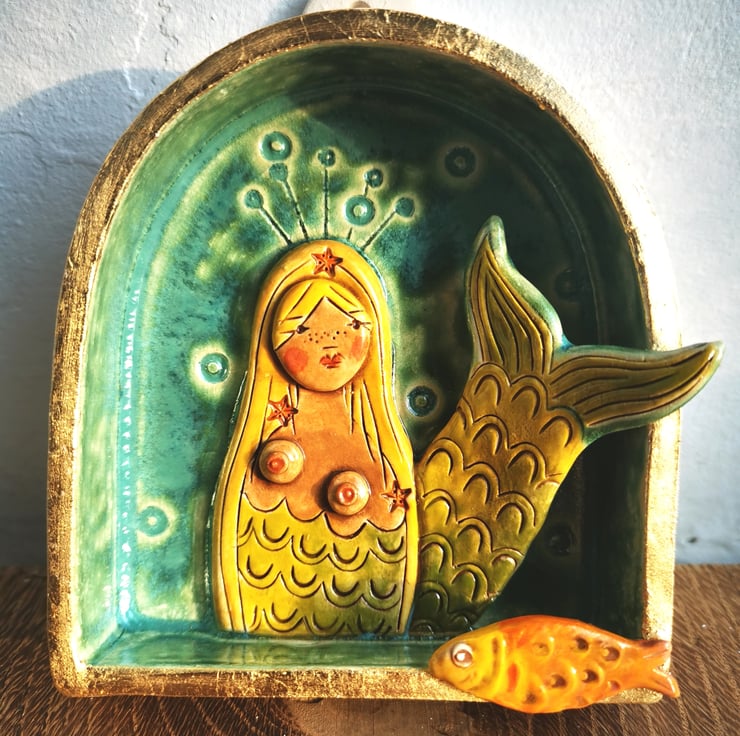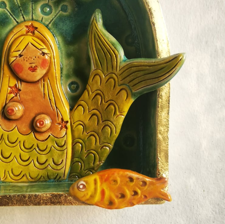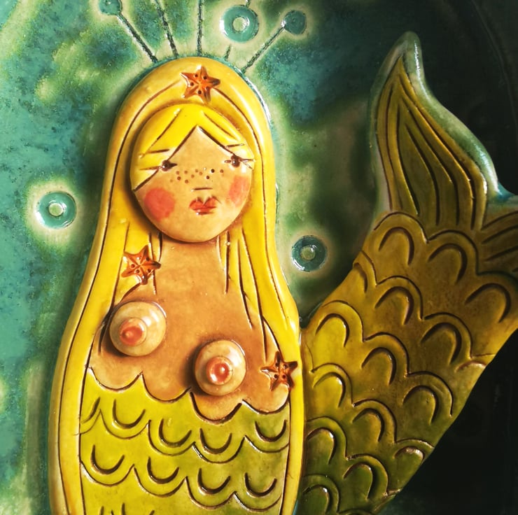 A handmade ceramic wall sculpture depicting a blond mermaid with starfish studded hair.
