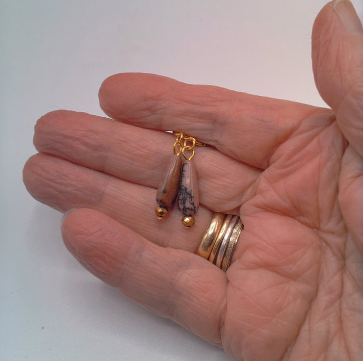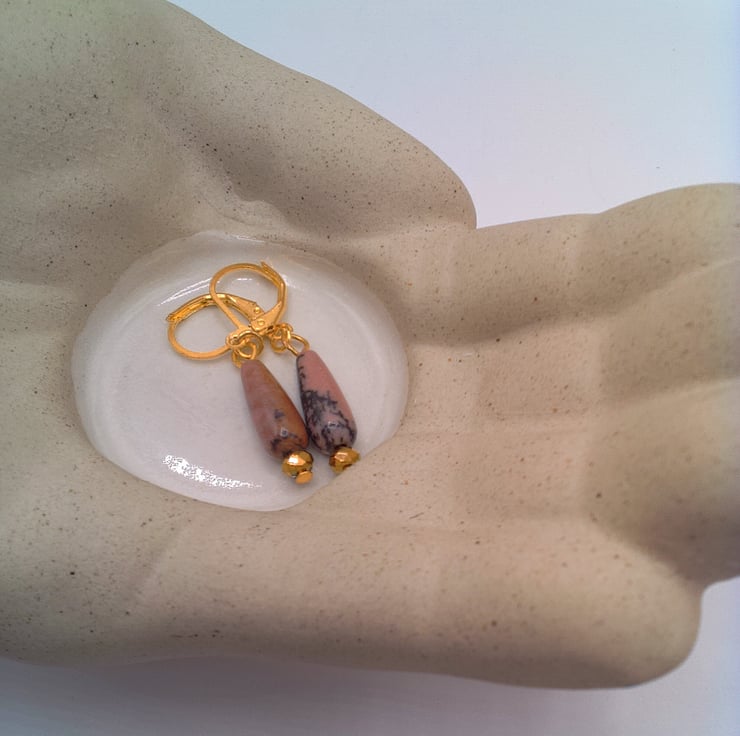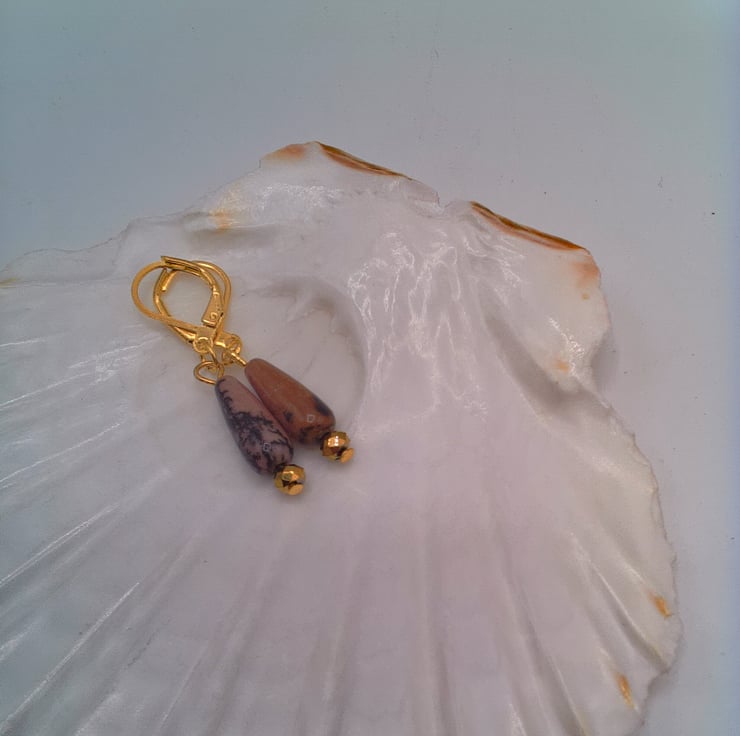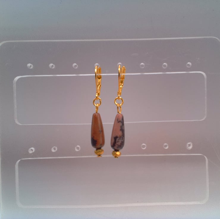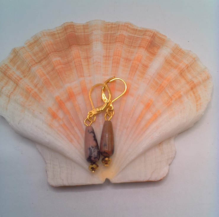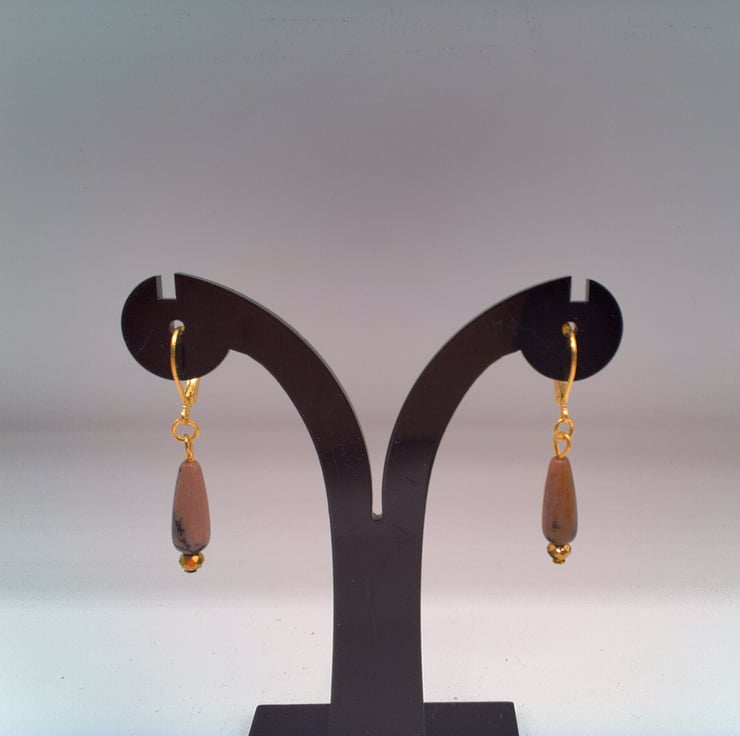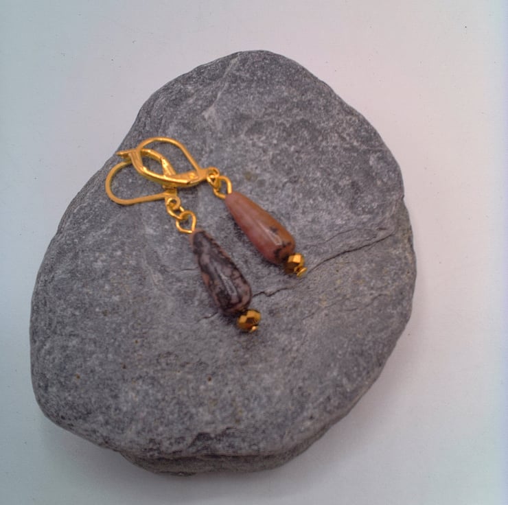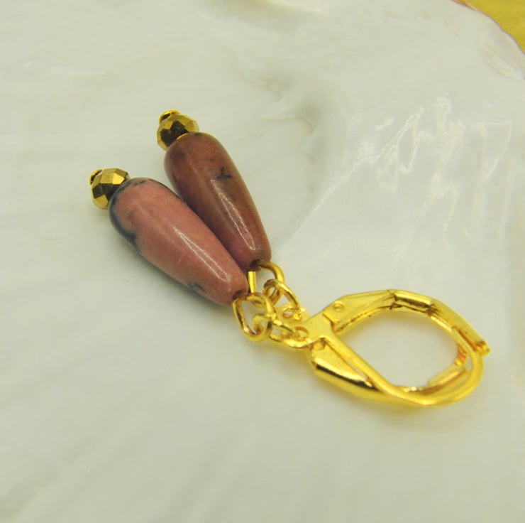 These gorgeous pink jasper and gold faceted bead earrings would go well with any outfit that you wear everyday or for a casual party. They would also make an ideal gift for your friends or relatives for a birthday or anniversary or a perfect treat for yourself. The 18 mm x 5 mm pink jasper drop beads and the 4 mm gold faceted bead are suspended on gold plated lever back ear wires with a drop of 1 inch (2.5 cm) from the base of the lever back. The earrings will be dispatched wrapped in tissue paper in an organza bag and delivered to you via Royal Mail first class post.