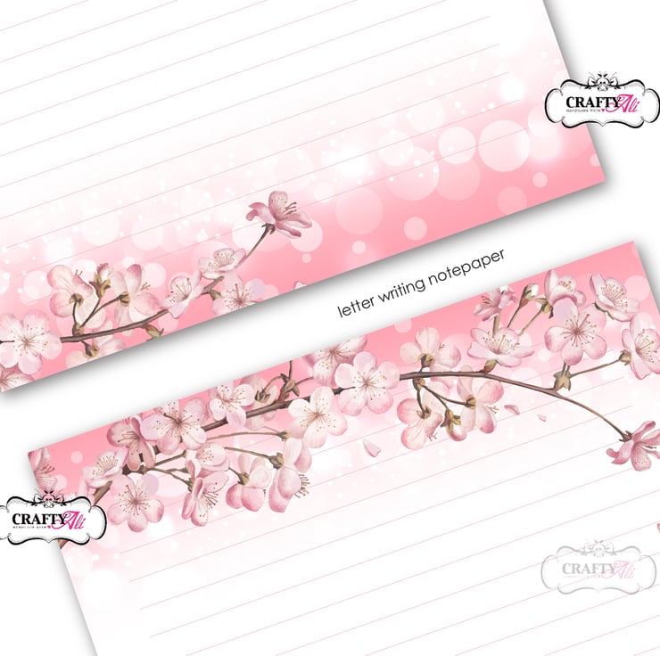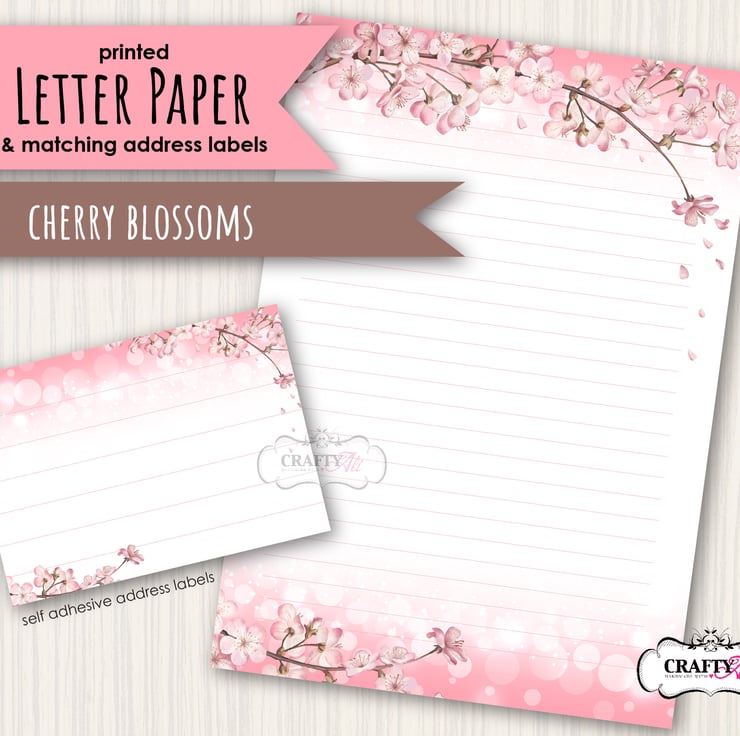 A set of 10 sheets of A5 size handmade letter writing / notepaper set with a pretty cherry blossom theme. Also included are 5 co-ordinating self-adhesive address labels (simply remove the backing paper).