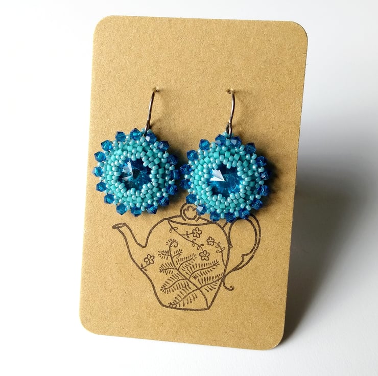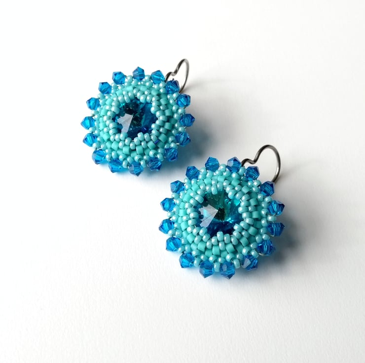 This pair features a beautiful Bermuda blue 12 mm rivoli (the centre) encased in aqua-turquoise seed beads. The earrings have been finished with a picot border of 3 mm crystal bicones in Capri blue. With flashes of blues, greens and turquoises, these earrings are perfect for summer days!