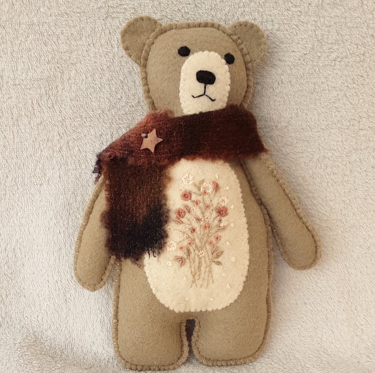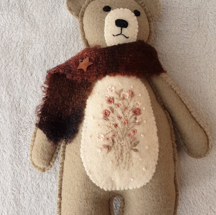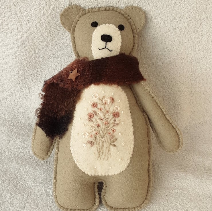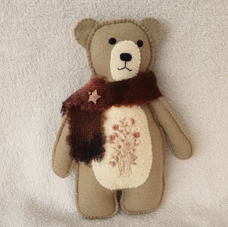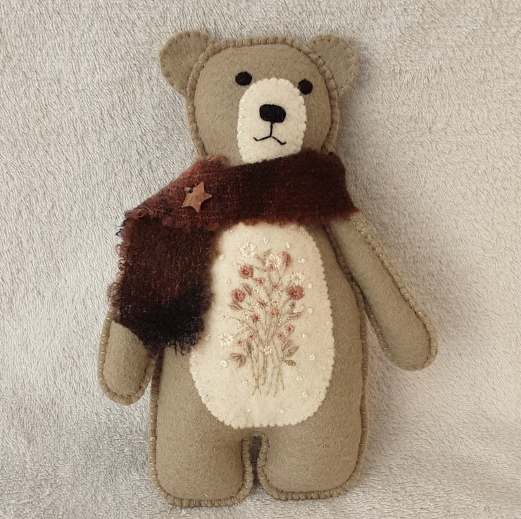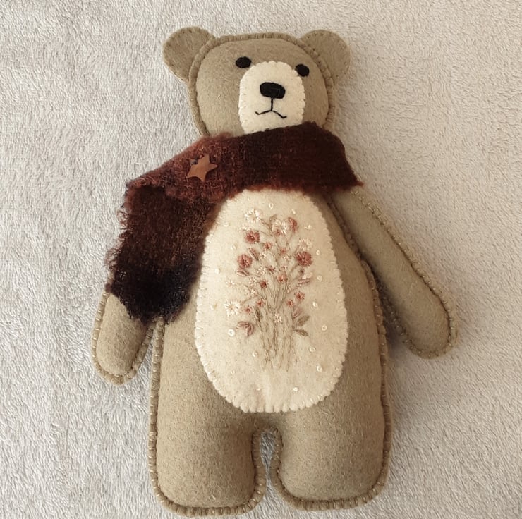 A hand embroidered simple scandi style blended wool felt teddy bear, designed to give as a keepsake gift.