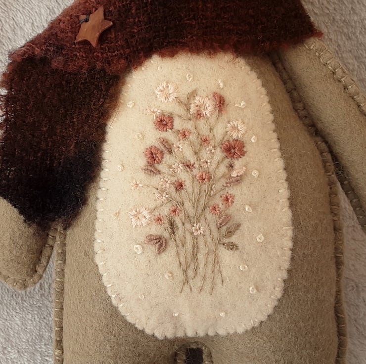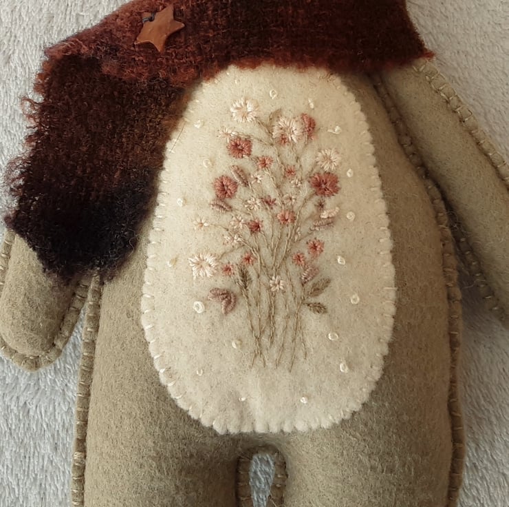 His contrast tummy area has been hand embroidered in a unique floral design in terracotta and rose pinks onto cream wool felt.