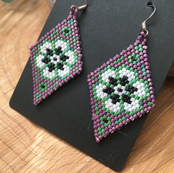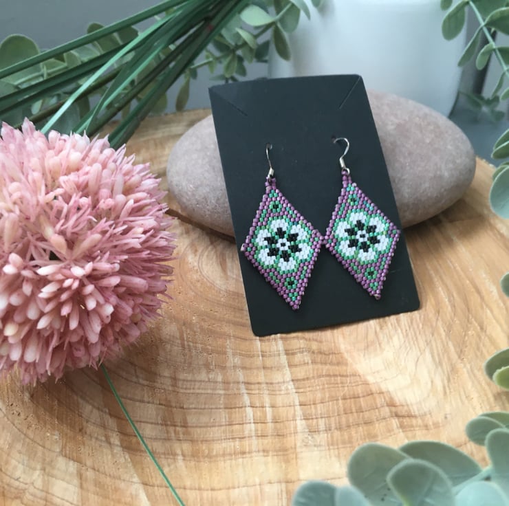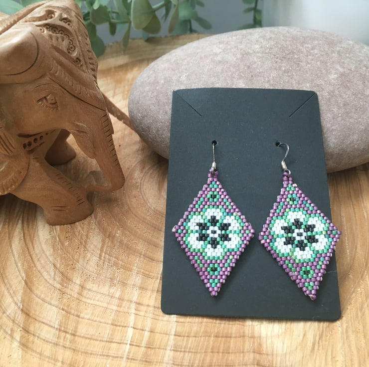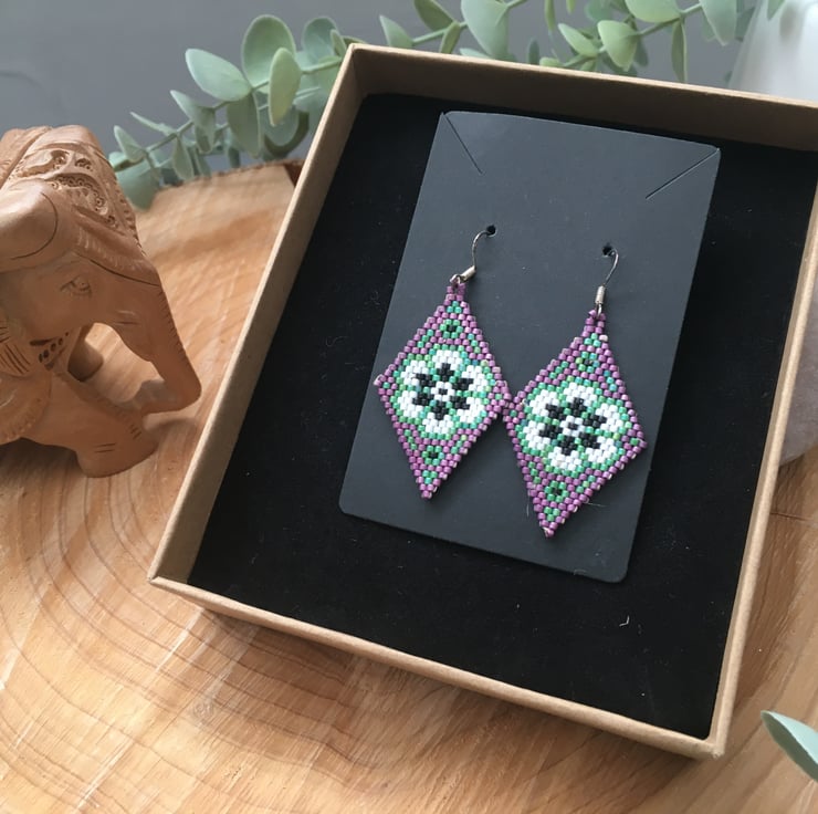 These beautiful delicate Pansy design earrings have been handwoven using tiny glass Miyuki Delica Size 11 seed beads. These wonderful beads from Japan are of the finest quality and come in an amazing array of beautiful colours.