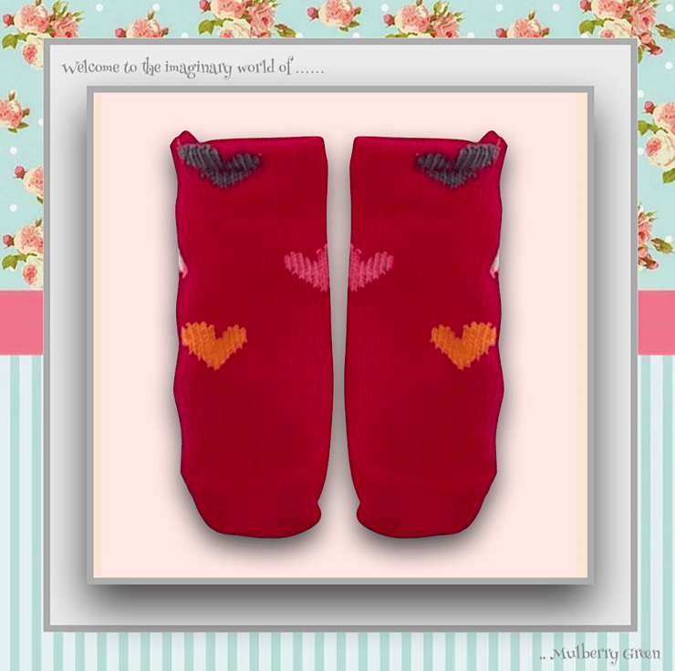 A little pair of bright pink heart socks to fit the Mulberry Green characters. The socks look lovely with the little felt shoes.