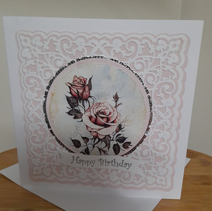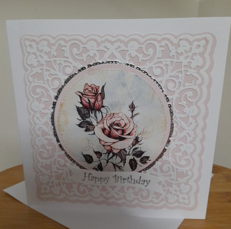 THIS LOVELY CARD HAS BEEN DESIGNED AND PUT TOGETHER BY MYSELF USING A LARGE WHITE CARD WITH LACE DIE CUT PAPER IN SHADES OF PINK AND WHITE ALONG WITH A SILVER COLOURED FRAMED PRINT OF A PICTURE OF PRETTY PINK ROSES ON A BUSH, AND FINISHED WITH A SILVER PRINTED HAPPY BIRTHDAY CARD EMBELLISHMENT.