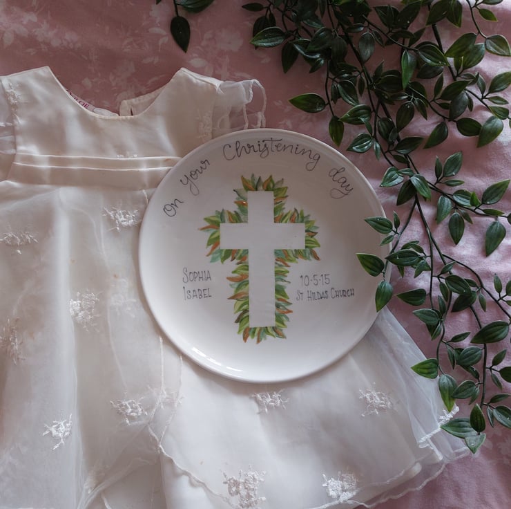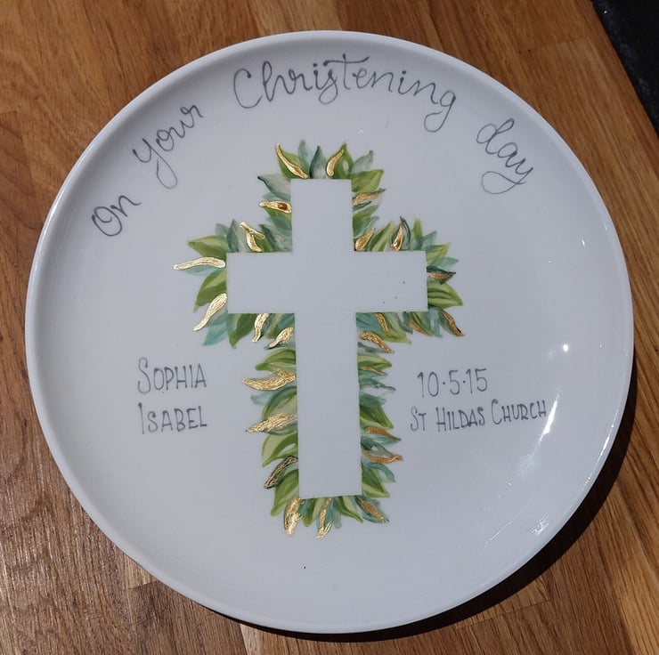 The plate showcases elegant grey lettering and a beautiful leafy crucifix design, enhanced with shimmering gold accents for a touch of luxury. If you prefer the word "baptism," please reach out, and I’ll gladly adjust the wording for you. The phrase "On your christening day" will be included automatically. Please specify the name and any additional details in the personalisation box; all lettering will be in stylish grey.