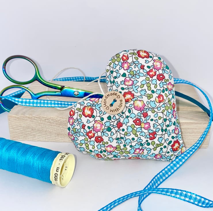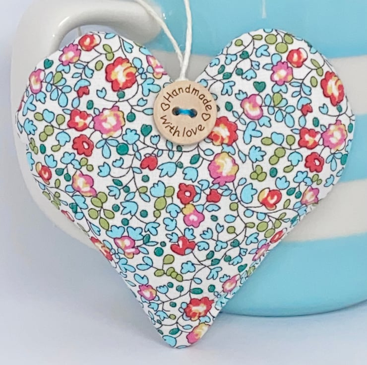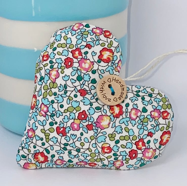 A gorgeous riot of pale blue and pink flowers strewn over a cream background, this exquisite heart decoration is made in a Liberty print tana lawn cotton. Packed with super fragrant Hampshire lavender and hand finished with a round wooden button inscribed with tiny hearts and the 'Handmade with Love' legend.