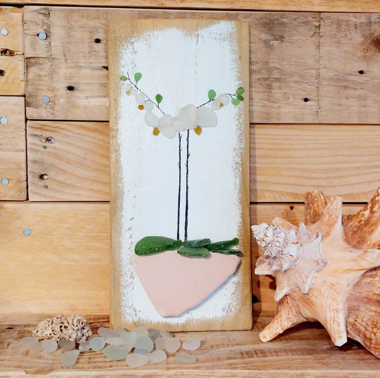 It features a striking white orchid housed in a pot created from a shard of pink pottery discovered on a Greek beach. The orchid's flowers, buds, and leaves are crafted from sea glass, while the remainder of the piece is meticulously hand-painted. The entire artwork is mounted on a piece of reclaimed wood that has been carefully sanded, painted by hand, and varnished.