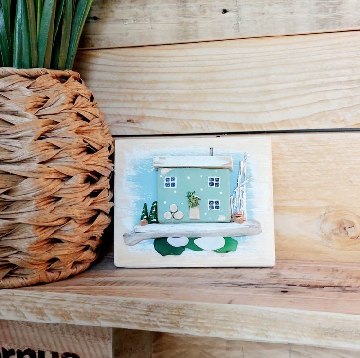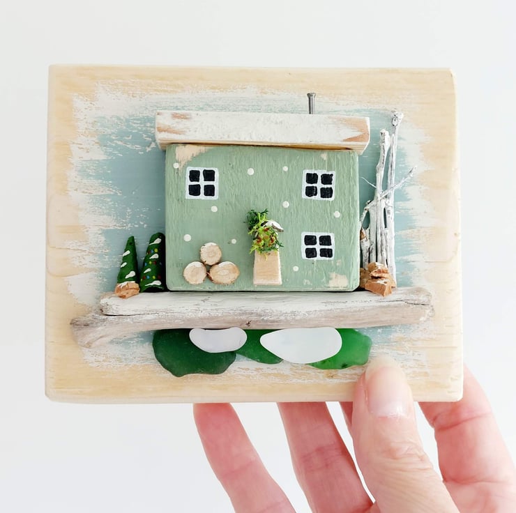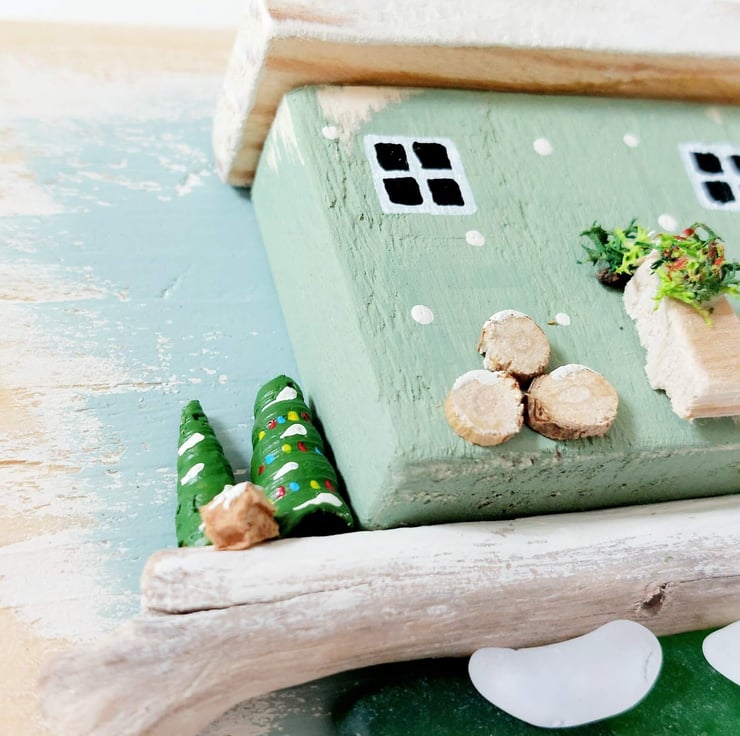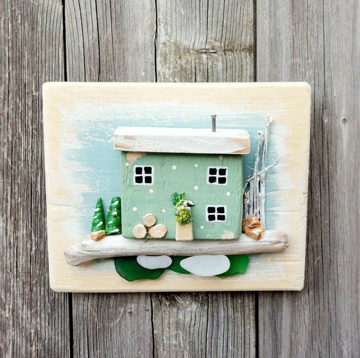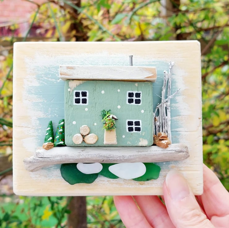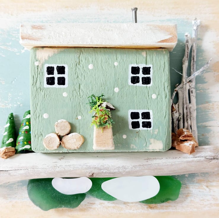 The little house is nestled on a beautifu piece of driftwood with sea glass underneath depicting the ocean. The whole piece has been created by hand, carving the little cottage from reclaimed pallett wood, before hand painting it and setting it onto a backing frame that has itself been hand painted in soft pastel blues. Extra embellishments in the form of cork, shells and tiny little log slices have been added to the miniature design to finish it off and provide extra festive details.