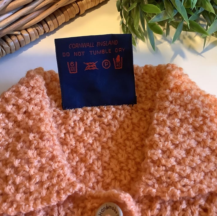 Baby knitwear is designed and hand crafted by Demelza Designs in Cornwall meeting UK baby safety standards, Only branded premuim acylic, acrylic/natural fibre blends or pure natural fibre yarns are used in baby knitwear which conforms to BS984/76 standards.