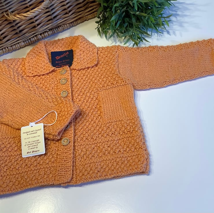 A unique light weight cardigan/jacket designed and totally hand crafted using quality machine washable knitting yarns set at low temperatures settings. The buttons are made from genuine wood with a sweet sentiment burnt etched on them. The sleeves have a double moss stitch panel matching the main body. The garment is extra long to cover the lower body even during growth periods.