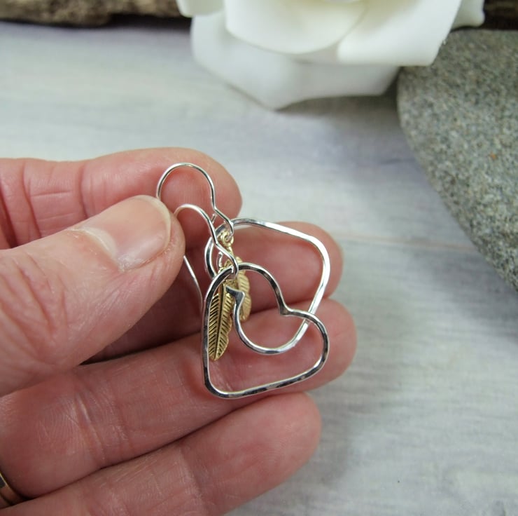 I have created the heart shapes from recycled sterling silver wire and textured them with my hammer and soldered them together then added a little gold plated silver vermeil feather charm. Fitted to sterling silver ear wires..