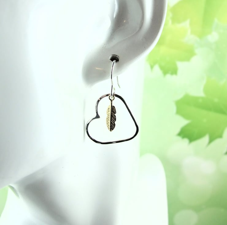 Sterling Silver Heart and Feather Earrings. Silver Heart Hoops with gold vermeil feather and Sterling Silver ear hooks.