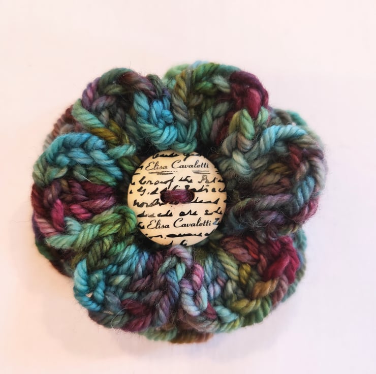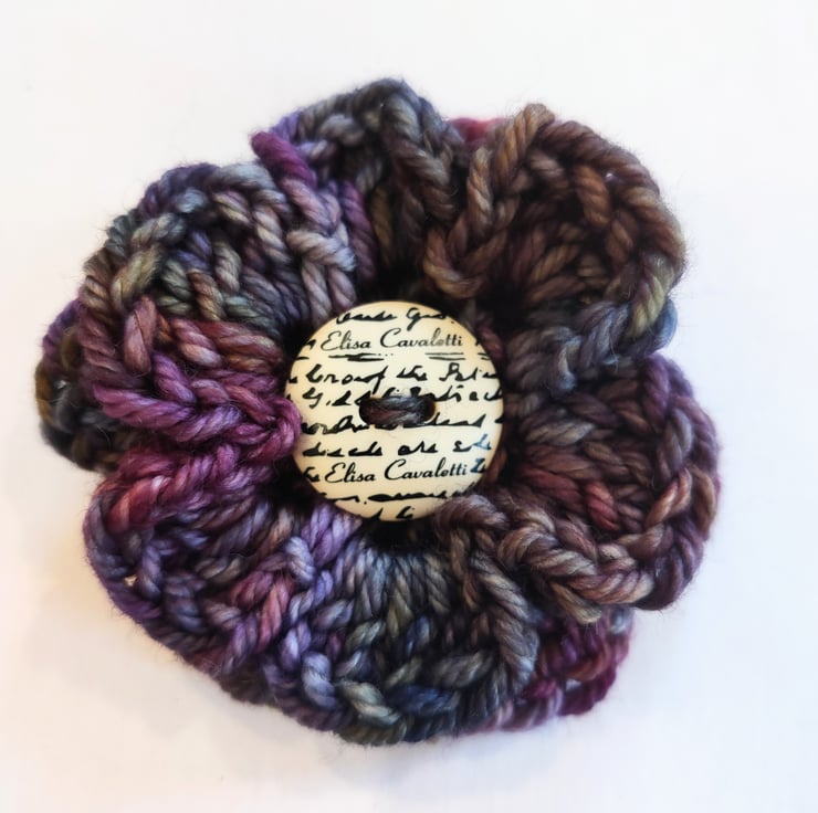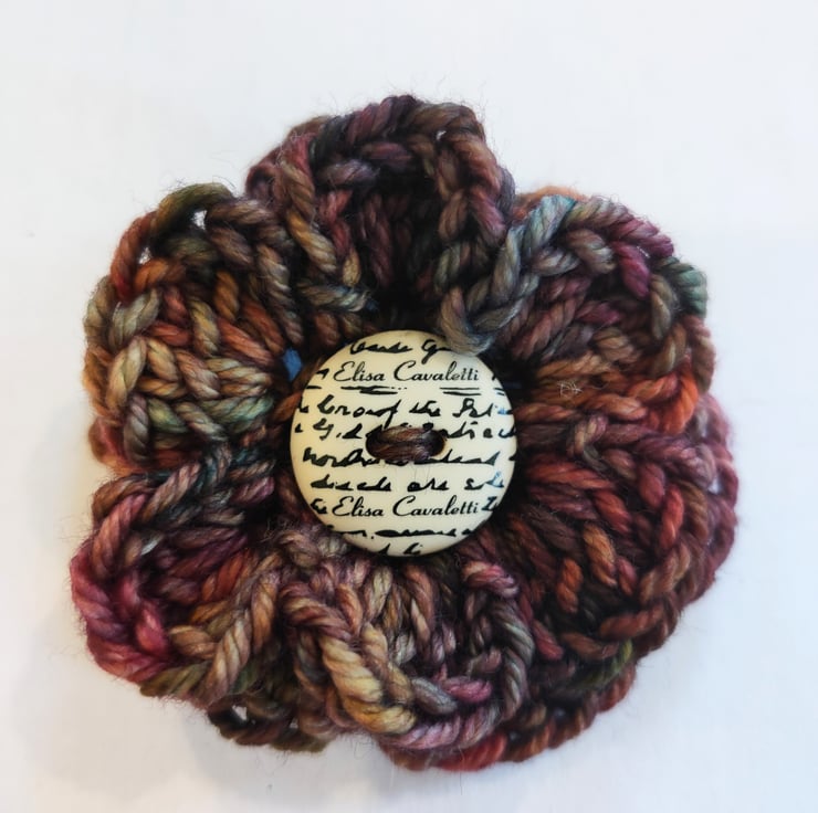 This brooch has been crocheted in 100% Merino and finished off with a button. It is approximately 5.5cm in size.