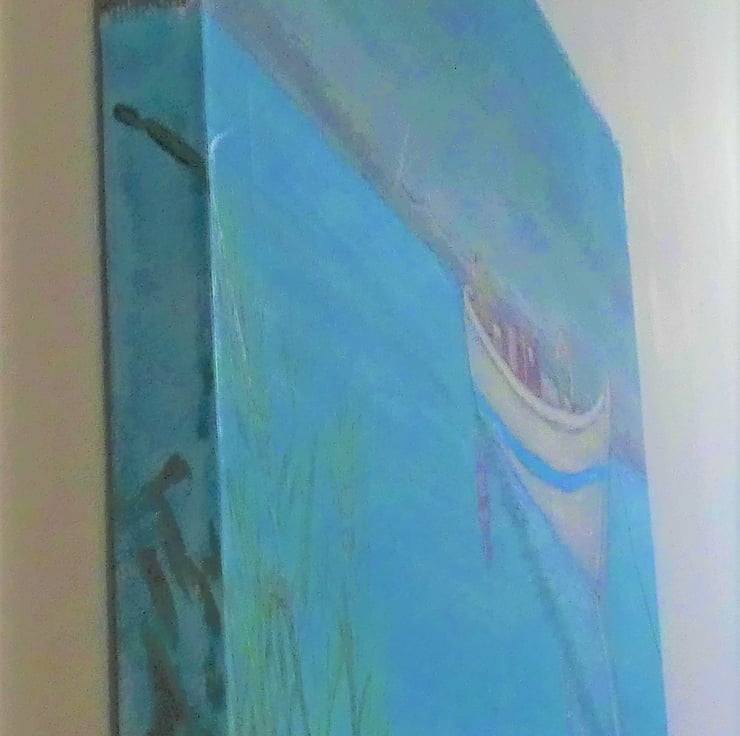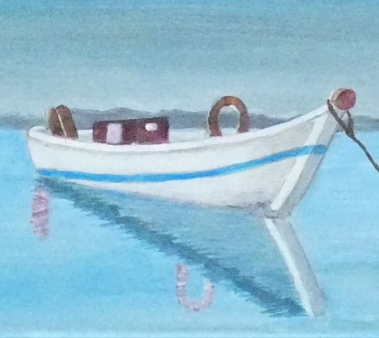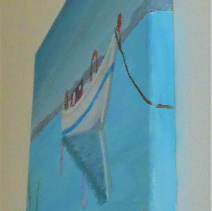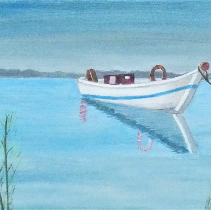 This one-off acrylic painting of a boat on the water is an original piece or artwork. This is not a print. It has been painted on a stretched box canvas and does not require a frame. The top, bottom and sides have also been painted. This would make a perfect gift for a number of occasions such as a housewarming gift, a Birthday gift, a gift for brother, a Christmas gift or a Housewarming gift.