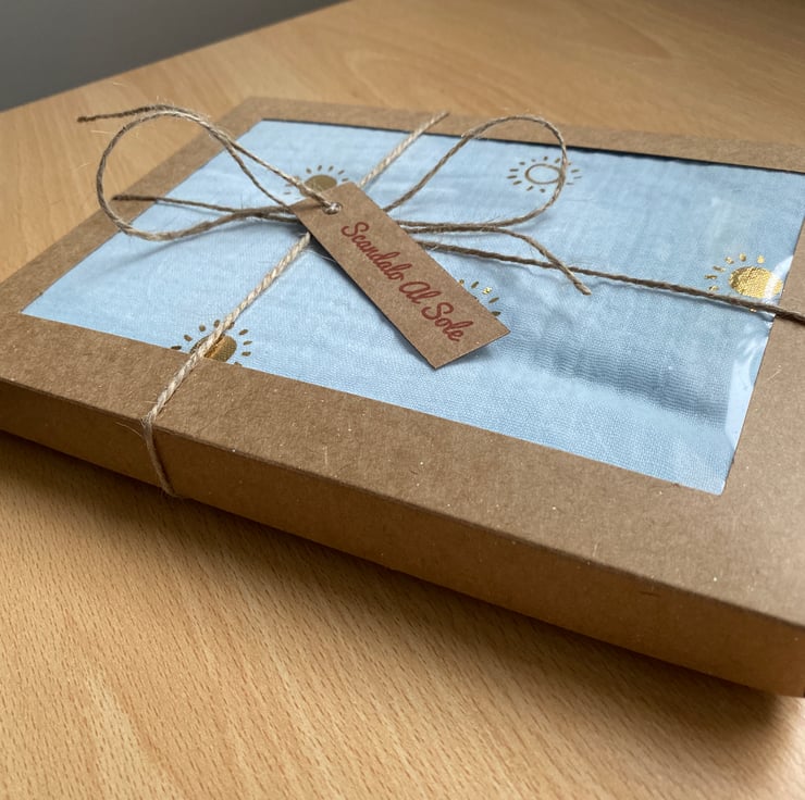 Kraft paper gift box available (see photos and select at checkout if required). The box measures cm 21 x 15 and it is tied with a natural string bow and tag. Very cute.