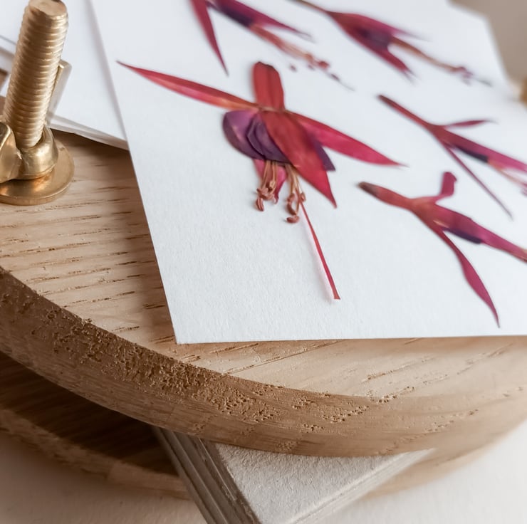 Featuring printed designs created from flowers that have been hand pressed by me, before being scanned and printed onto a beautiful ivory, uncoated, silk card. The card is made in Europe and FSC® certified – materials used to make the card have been ethically sourced from well-managed and sustainable forests.