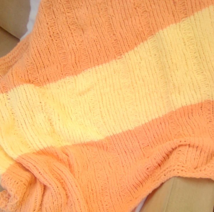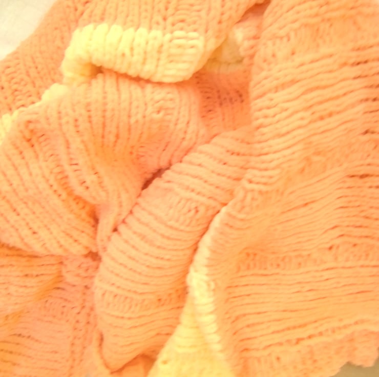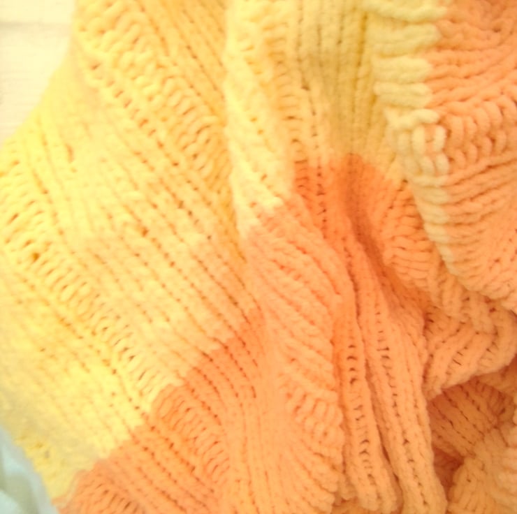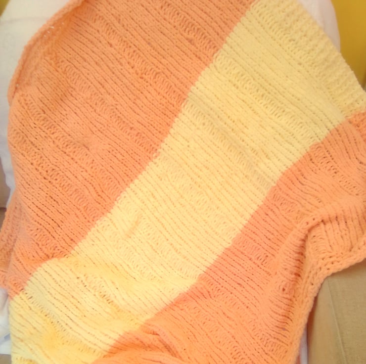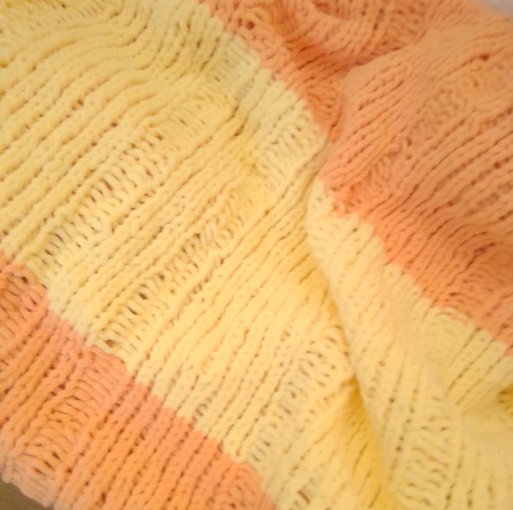 Very pretty but practical and warm large fleecy baby's blanket. It is hand knitted in a thick fleecy chenille yarn so is very warm and cosy for the chilliest days and soft against baby's skin.