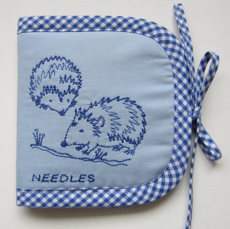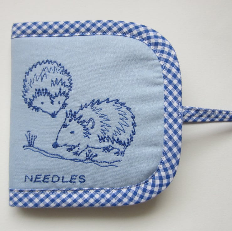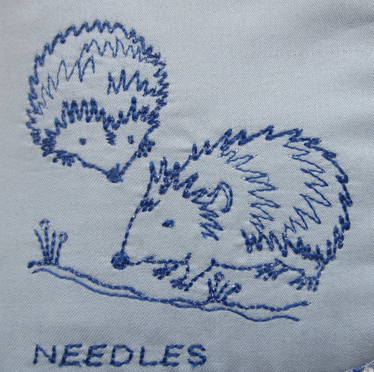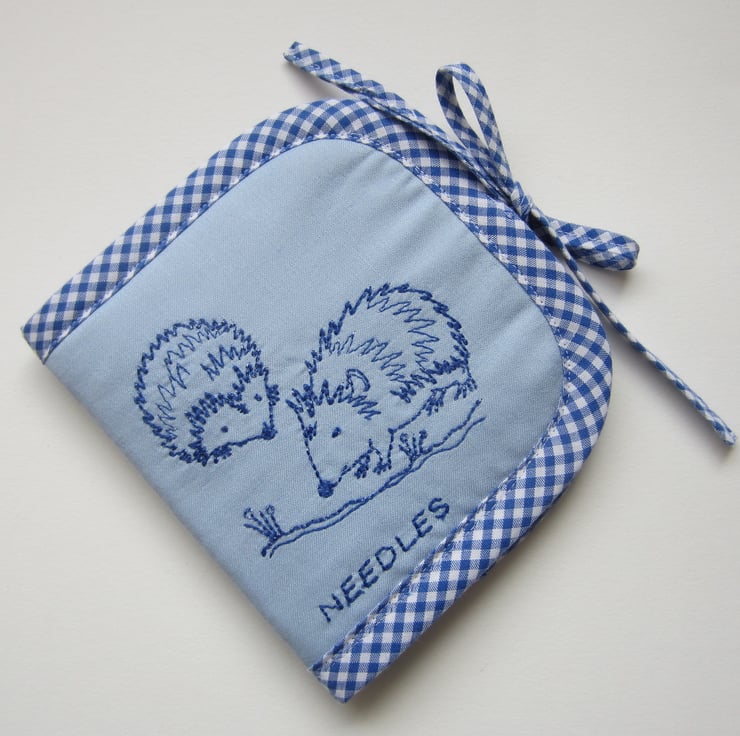 Lightly padded pale blue sewing needle case decorated with embroidered hedgehogs.