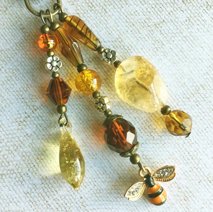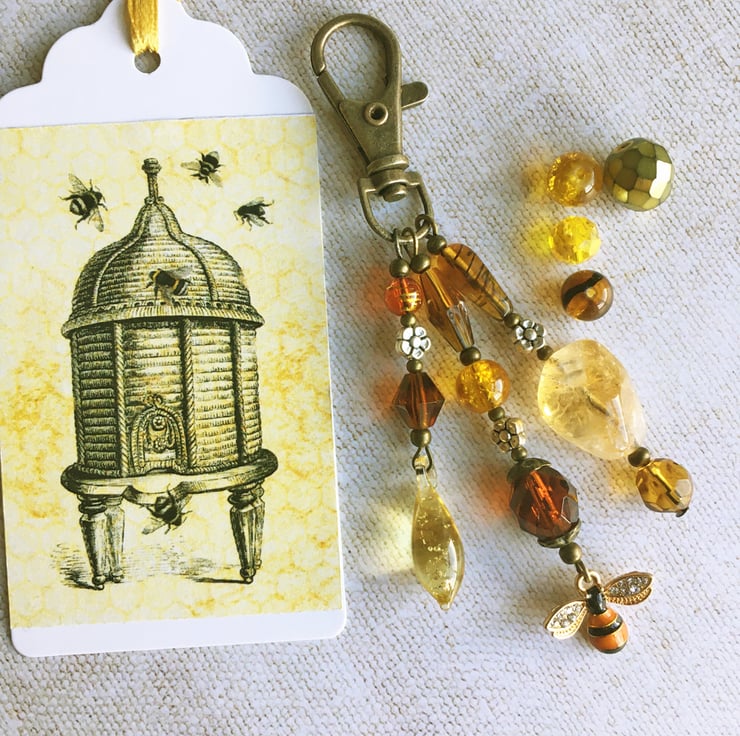 This pretty bag charm has a small metal bee, Citrine nugget and a selection of glass beads in amber and honey tones. I've also used tiny silver-tone flower spacers.