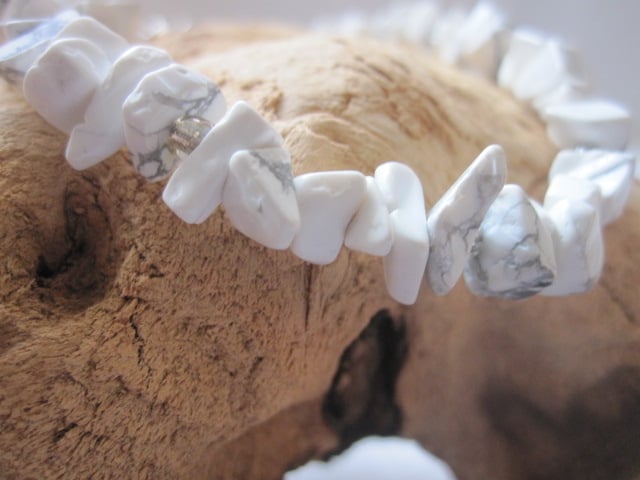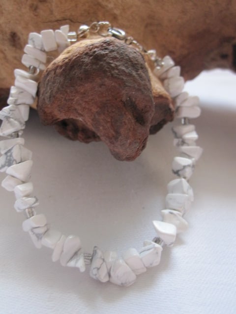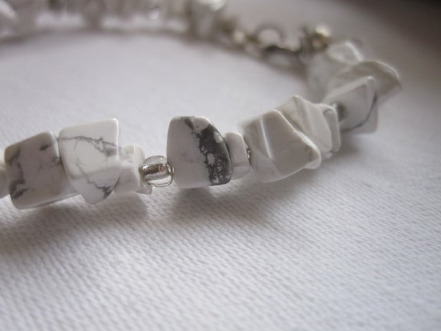 A light weight bracelet made using white Howlite tumble chips. The chips are various shapes and sizes and some will have grey veining in them. It is approx. 7.5 inches in length and approx. 1cm at it's widest point. The findings are silver plated and the clasp is a bolt ring clasp. This bracelet will come in an organza bag. Gift boxed options available at checkout.