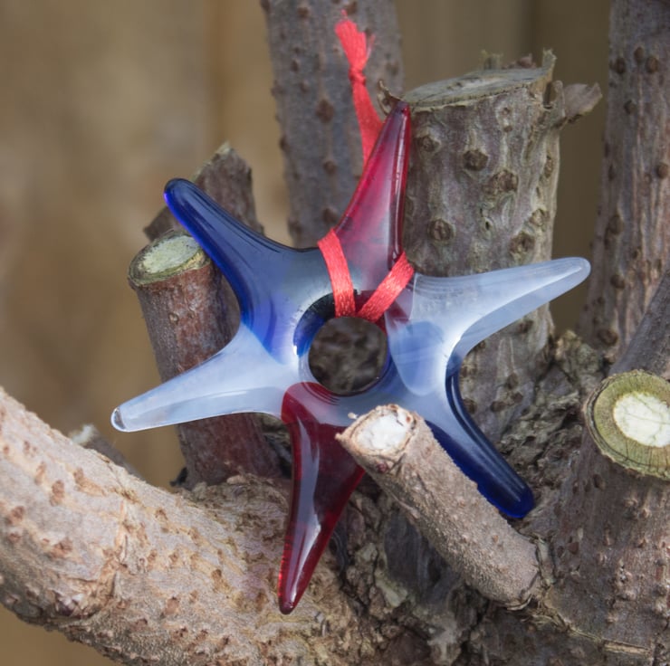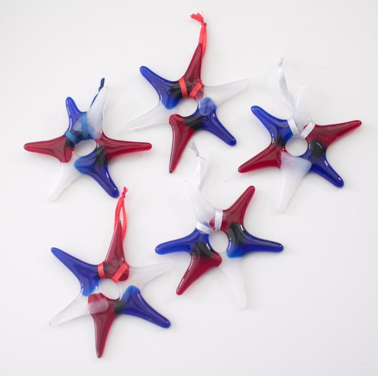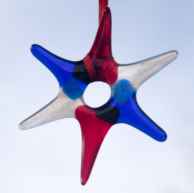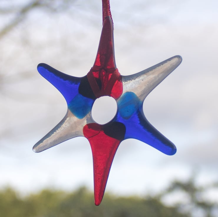 The stars are each made from 6 hand-cut pieces of decorative glass which are fused together to form our shape. Once cooled we hang them from a piece of colourful ribbon. They are approximately 8cm from tip to tip, but as tall the glass is hand-cut, this will vary from star to star