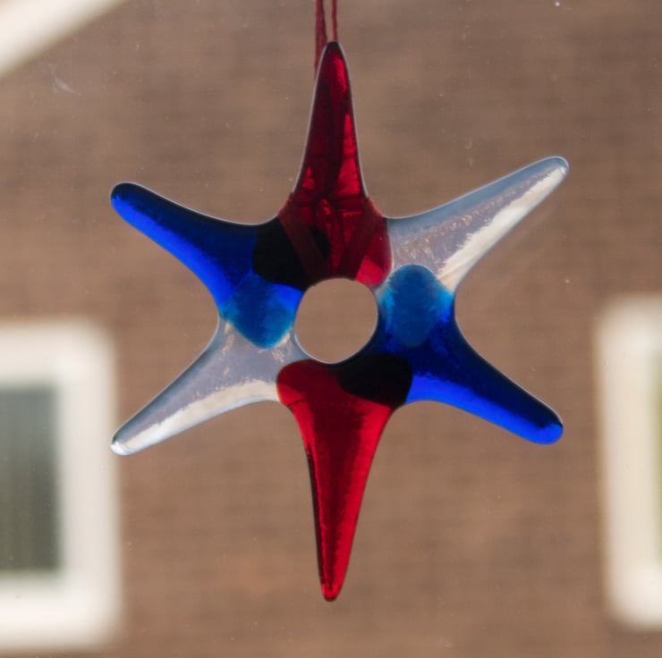 These stars have been created to celebrate the coronation of King Charles III in May 2023. Each 6-pointed star has 2 points in each of our national colours of Red, White & Blue. All the glass is Translucent so the light shines through.