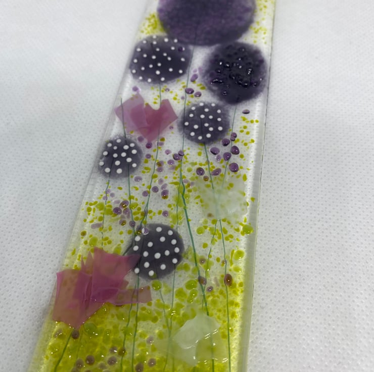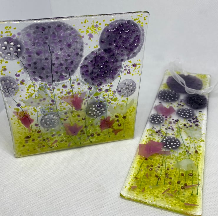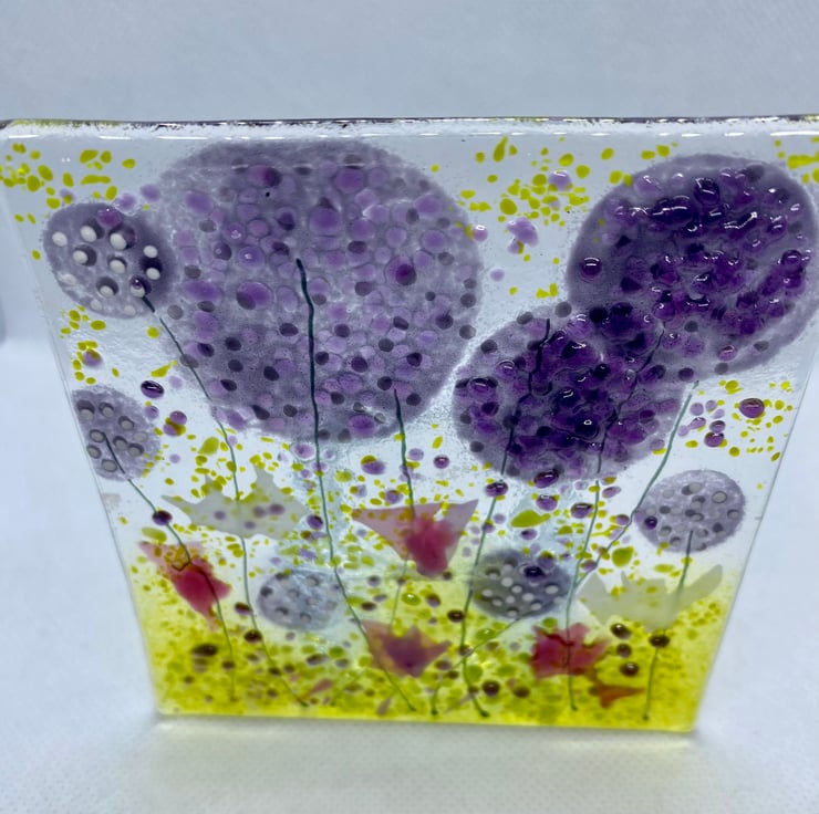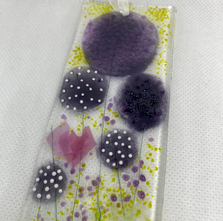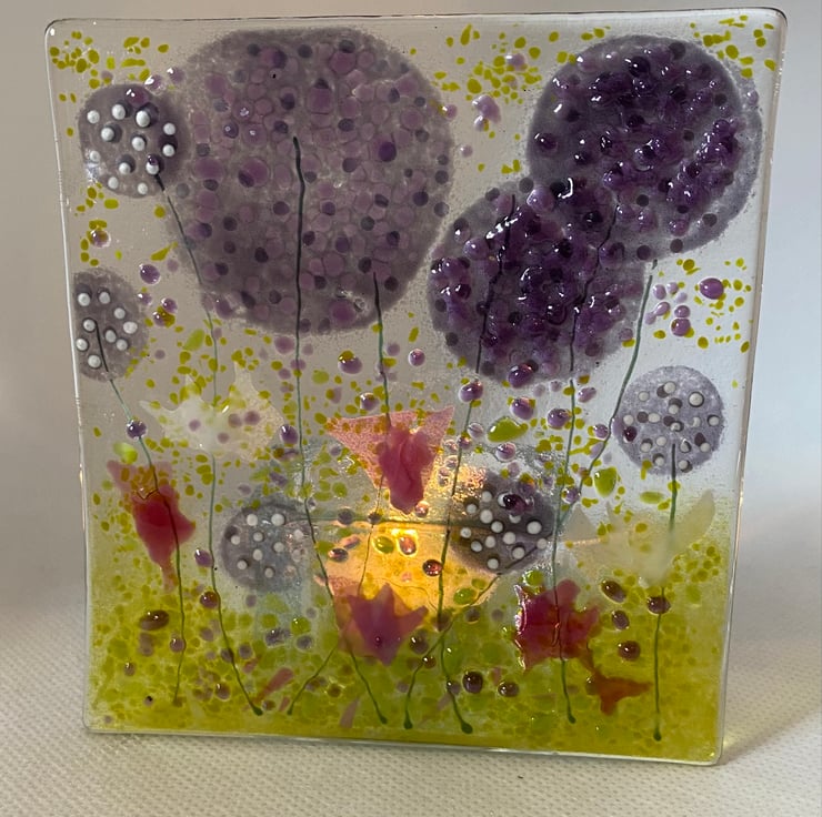 A choice of two pieces featuring purple alliums amongst little pink and white flowers. Choose from a hanging light-catcher or a tea-light shade - both feature the lollipop-style alliums.