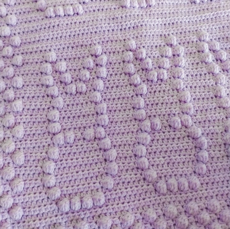Snuggle your little one in cosy comfort with this hand-crocheted baby blanket in a soft lilac shade. Featuring sweet bunny designs and a playful bobble stitch border, it's perfect for cuddles, naps, or stroller rides.