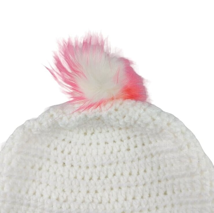 Each hat features a charming bobbly puff flower on the front left side for added character. The standout feature is the detachable faux fur pompom, which comes in elegant white with pink and purple tips. The pompoms attach easily with an elastic loop that fastens securely to a button inside the hat, providing a versatile and stylish accessory.