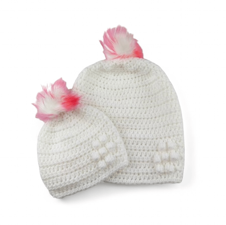 Stay cosy and stylish with these delightful matching crocheted hats for mums and babies, ideal for keeping you both warm on chilly days. Hand-crocheted with care from soft aran weight white yarn, these hats are perfect for outdoor adventures or casual outings.