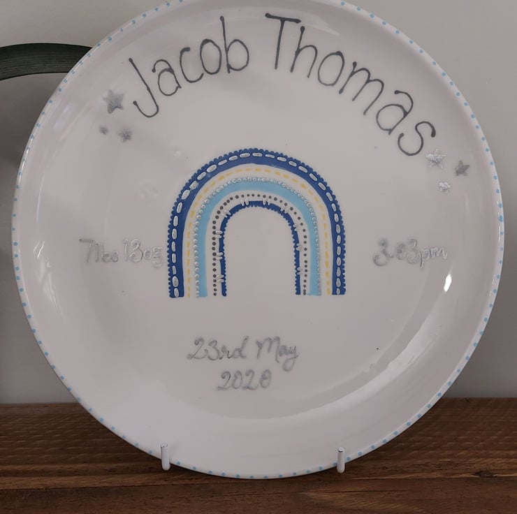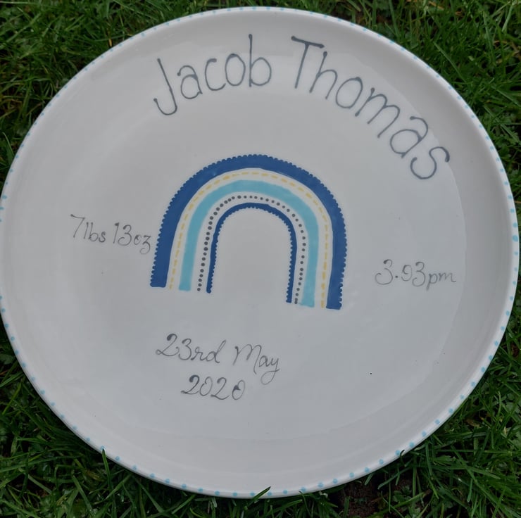 Celebrate a precious occasion with our custom-made ceramic baby plate, featuring a delightful rainbow design. This personalised plate is perfect for commemorating events like christenings, baptisms, or baby naming ceremonies.
